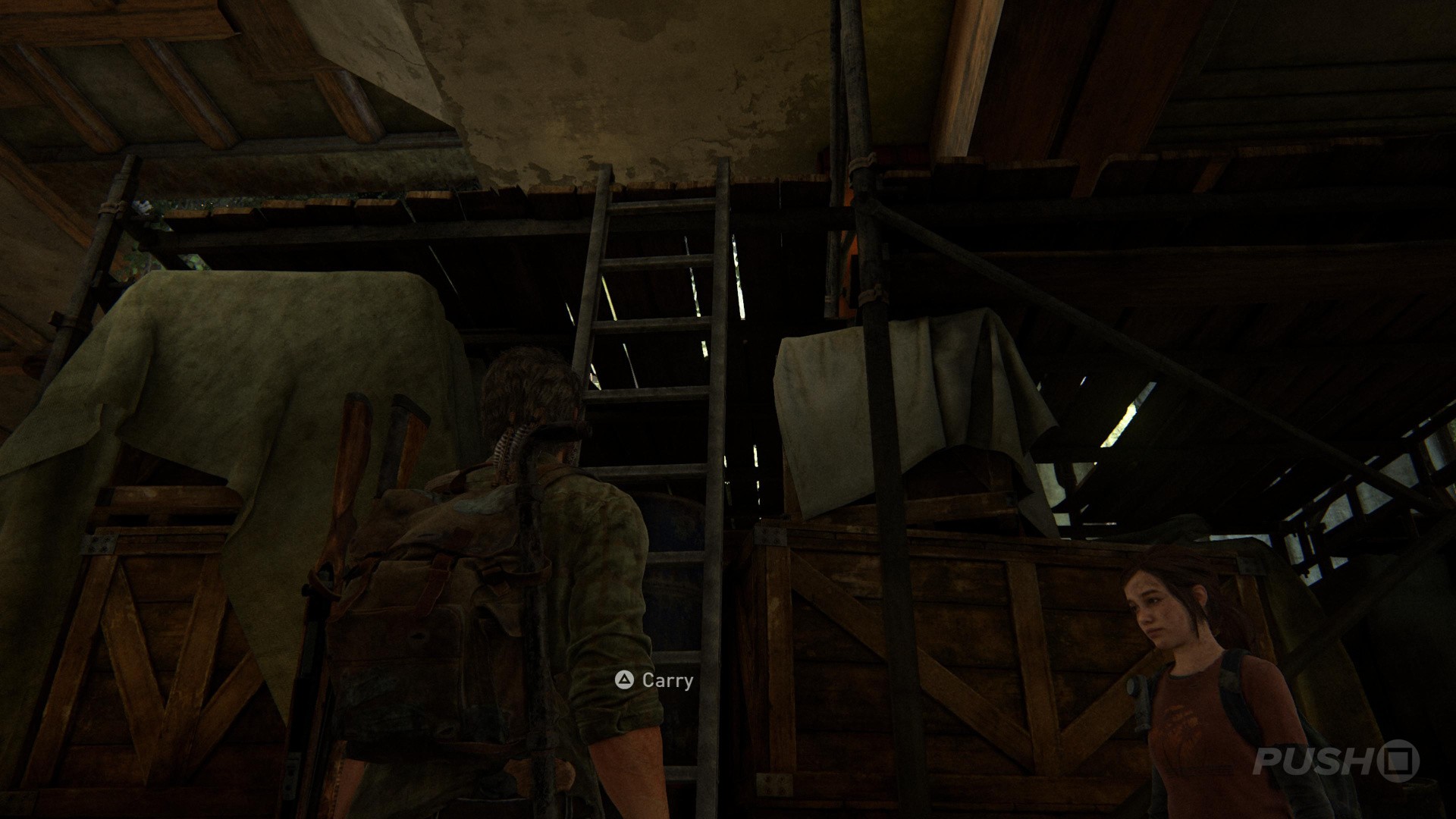 Continue down the corridor, right of the exit from the Workbench. There's a Clicker in this kitchen, but it'll be quickly taken out by bandits. Unfortunately, those bandits are looking for you. Keep a low profile and stealth kill them all, ensuring you have your weapons reloaded in case things go south. There are some additional supplies in the freezer room if you need them. Once you're done, make your way into the dining room area and grab the ladder at the far end of the room. Prop it up against the ledge nearby, and climb up. Be ready because you're going to get kicked back down, but Ellie's got your back. Phew!
