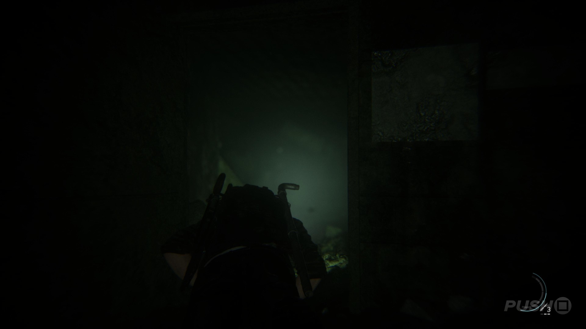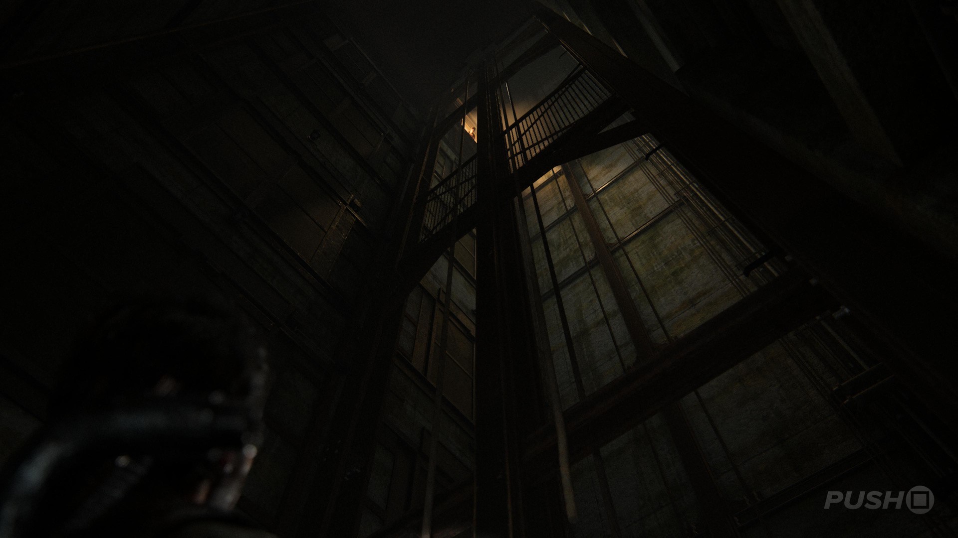 Head up the stairs when you're ready to move on from this floor. There's a lift door ajar at the top, so interact with the prompt to prise it open. Then climb the ladder on the other side.