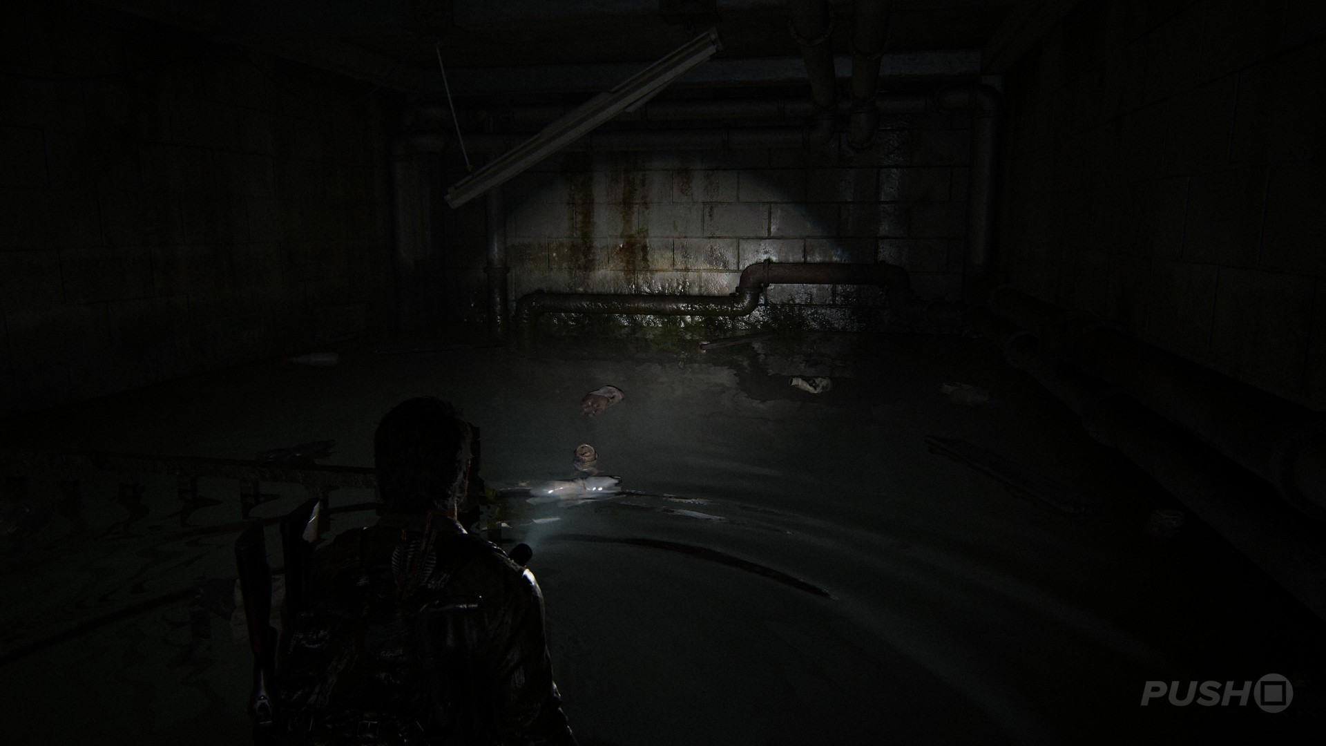 Shimmy along the lift shaft and drop down onto the lift. Wait for Ellie to join up with you and then boost her up onto the ledge. Inevitably the lift will collapse and you'll be separated from Ellie. Time to do some swimming, then.