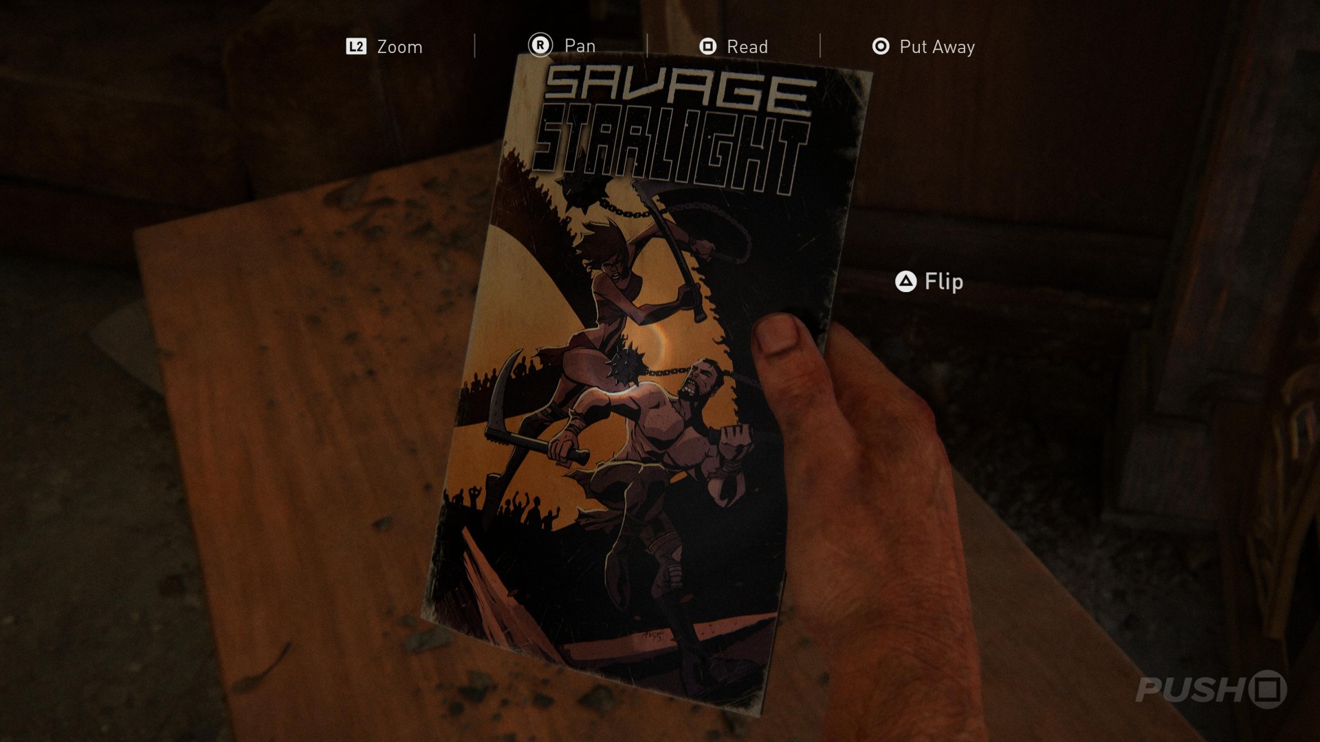 After Ellie kills the bandit, climb up the ladder and go through the conference room. Exit the corridor on your left back into the dining room and shimmy along the ledge. There's a Comic named Accretion on the coffee table near to all the chairs. Be sure to gather up all the supplies in this area before returning to Ellie.