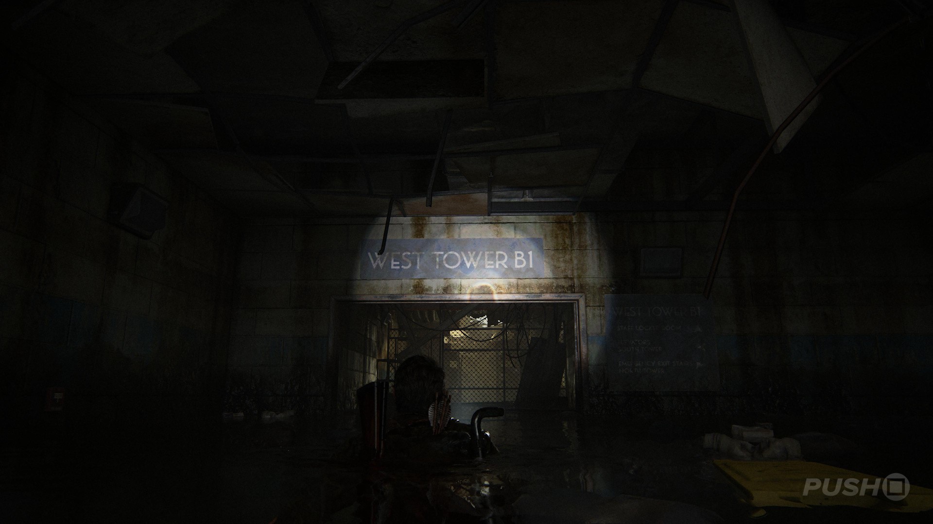 Swim into the next room with the waist-high water and go straight on. Jump over the debris towards the door with the exit sign above it. While it may not be immediately obvious, there's a staircase here, so dive under the water and follow the tunnel around until you can next surface in a room with a doorway marked West Tower B1.
