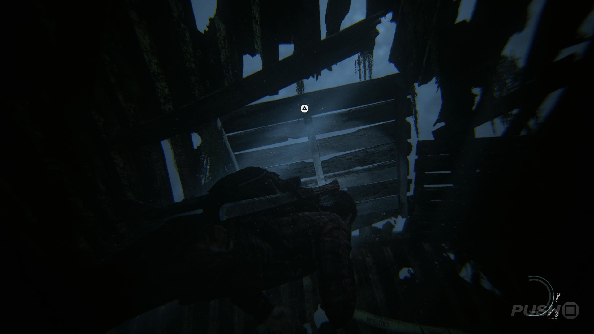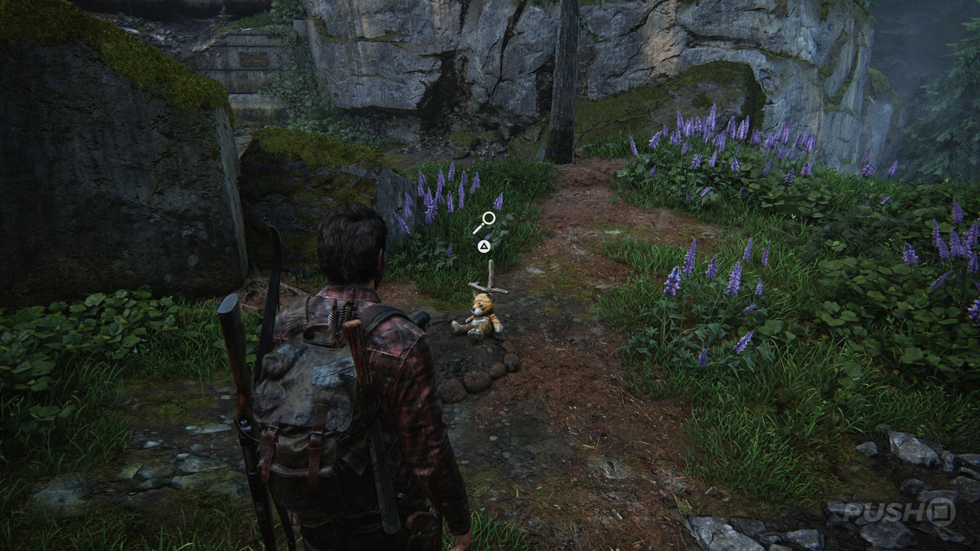 Once you reach the other side of the bridge, after Ellie's turned the wheel, you can choose to give her a high-five with triangle. If you don't, then you'll get the Left Hanging Trophy. Then, drop down to the campsite on the left and find the grave with a teddy bear next to it. Interact with it for an Optional Conversation opportunity.