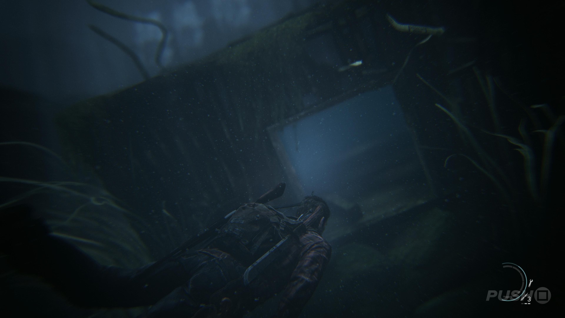 Once you're done, head back outside and interact with the big red wheel. Turn it to close the dam halfway. Dive into the water, and look for the building at the bottom. Head in through the open window and dislodge the wooden pallet by pushing the triangle button. Now swim back to the surface.