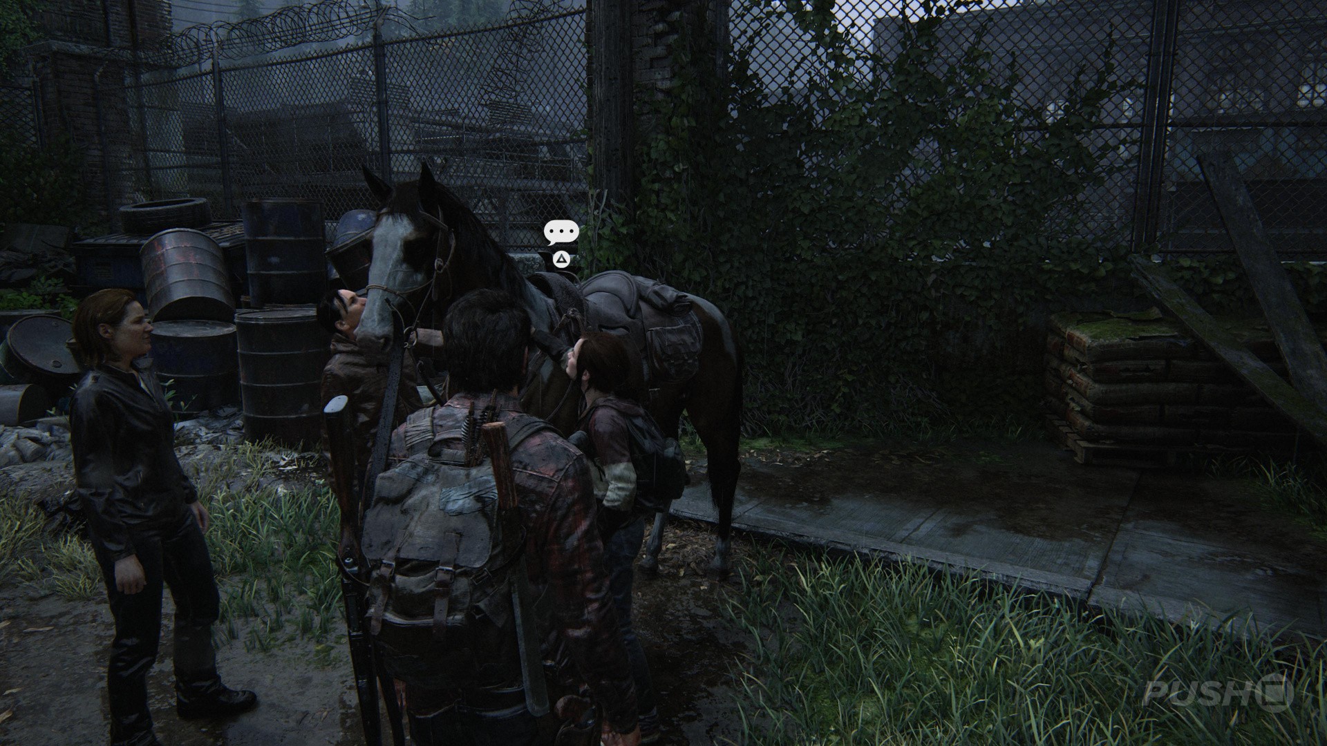 When Ellie rushes over to the horse, this will trigger an Optional Conversation opportunity, so be sure to respond to the prompt. You can also pet the horse yourself if you want to. (We're going to assume you do.)