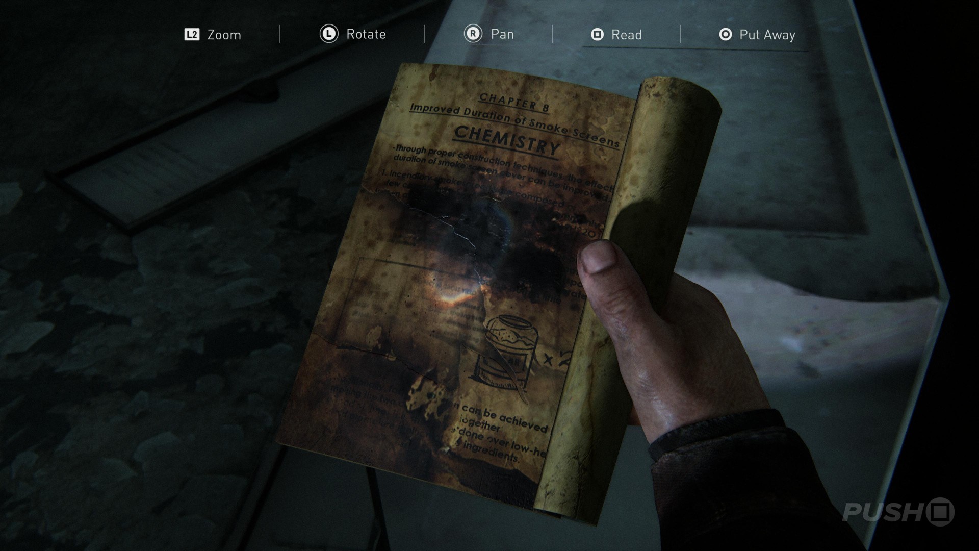 Continue to follow Tommy, ensuring to pet Buckley along the way for the Who's a Good Boy? Trophy. Be sure to collect the Supplements in the control room, and then grab a Training Manual named Smoke Chemistry from the turned over locker. This will be on the corner of the main console in The Last of Us and The Last of Us Remastered.
