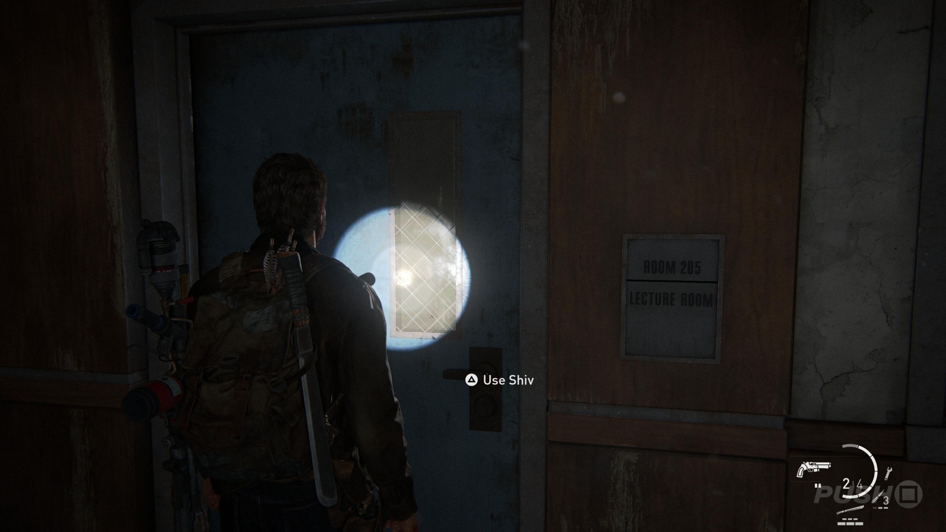 Follow the main corridor as far as you can go, and you'll happen upon a blue Shiv Door, marked as Room 205 Lecture Room. Unlock it and loot the supplies on the other side.