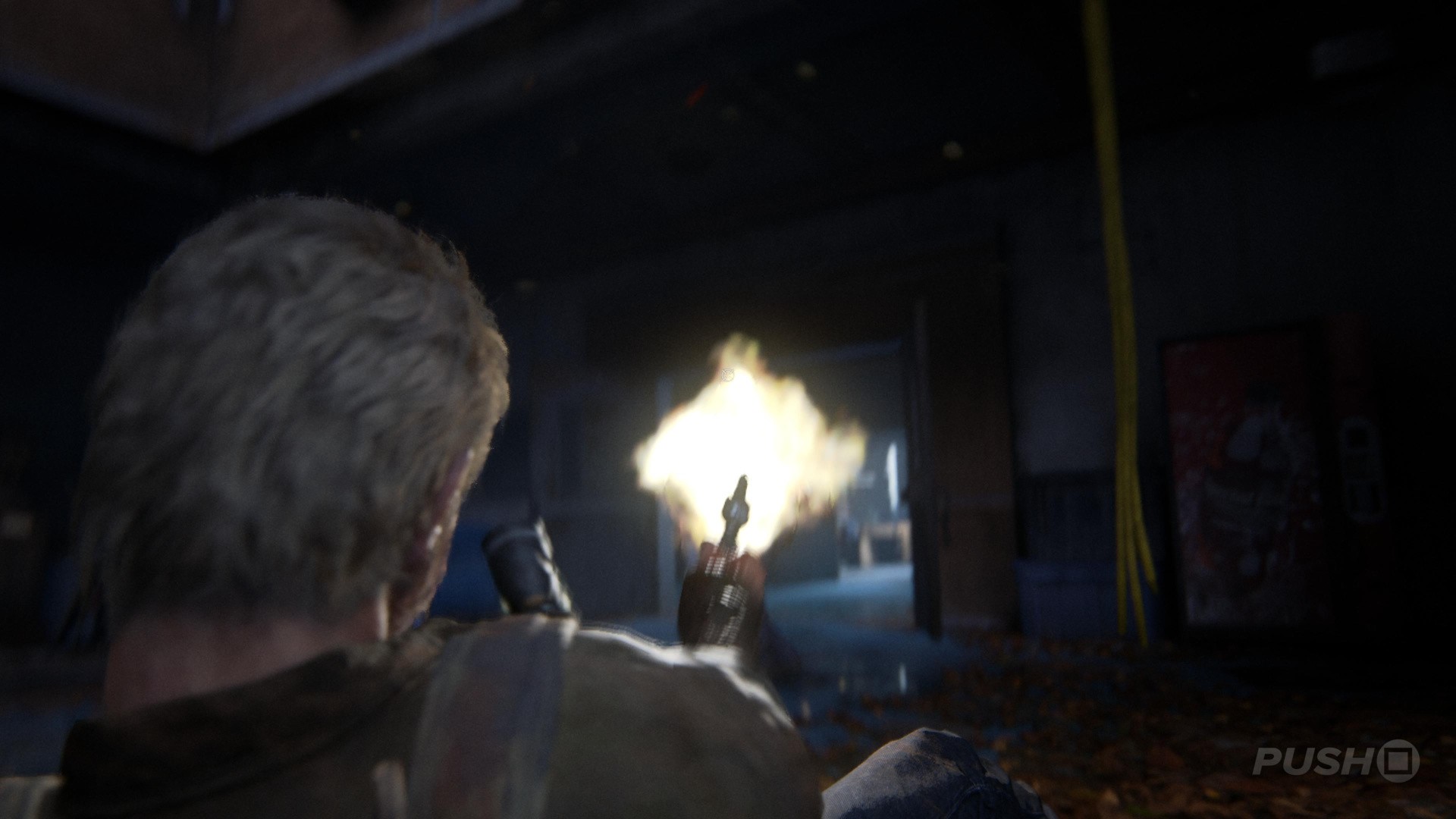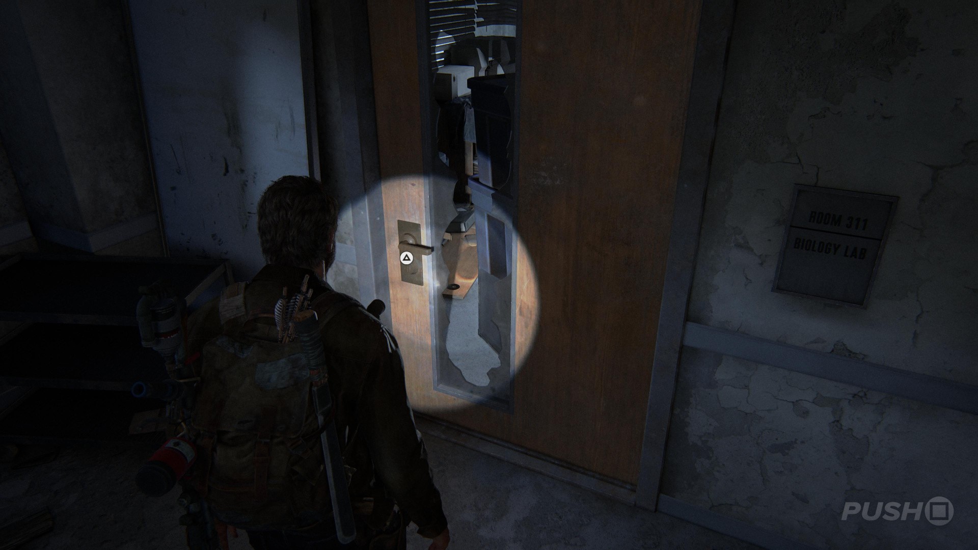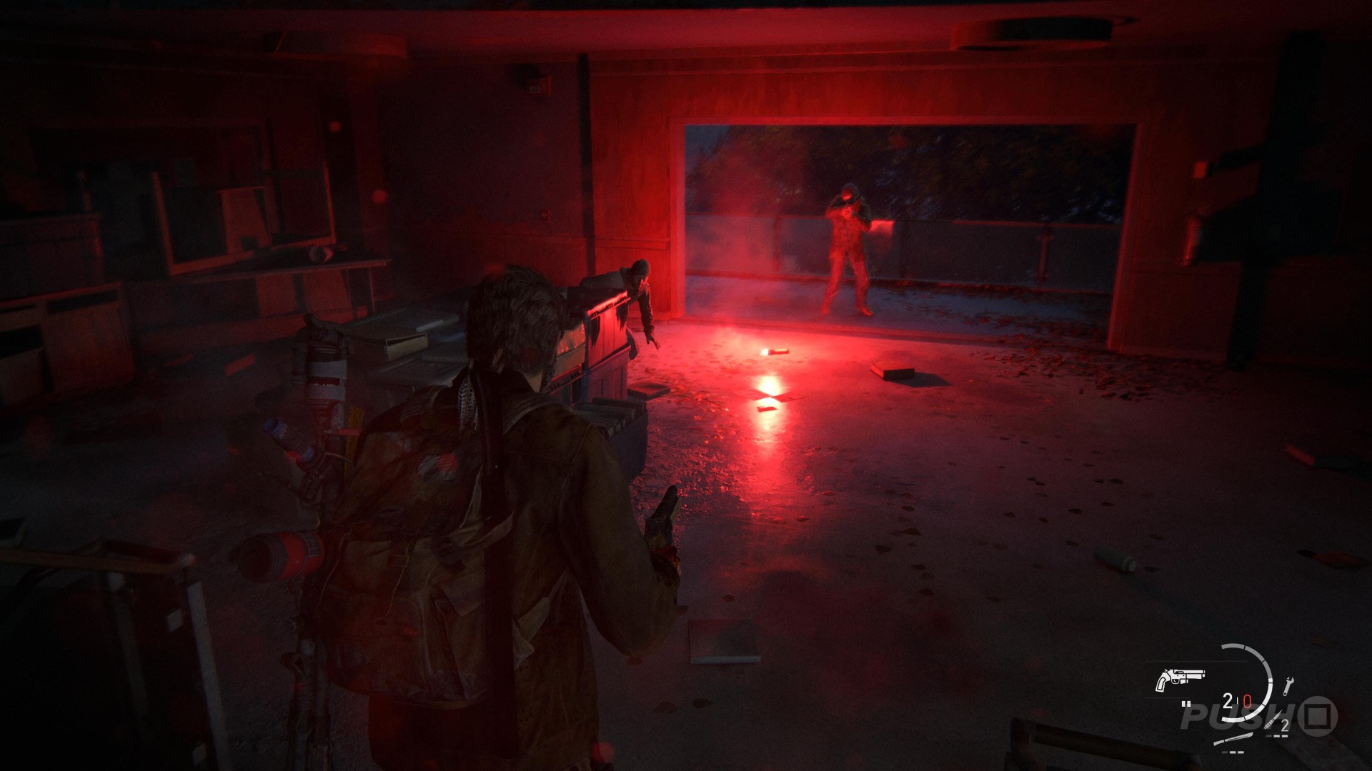 Well, you finally know where to find the Fireflies, but you're under attack. It's time to get out of the Science Building, and unfortunately you're going to have to fight your way to the exit. Remember to stay low, use cover, and pick off the bandits when they peek out. If you're not sure which way to go, then follow the flares down the stairs. You'll eventually come to a closed door, but be prepared when you open it, because you're going to get into a scuffle. Tap the square button to fight back.