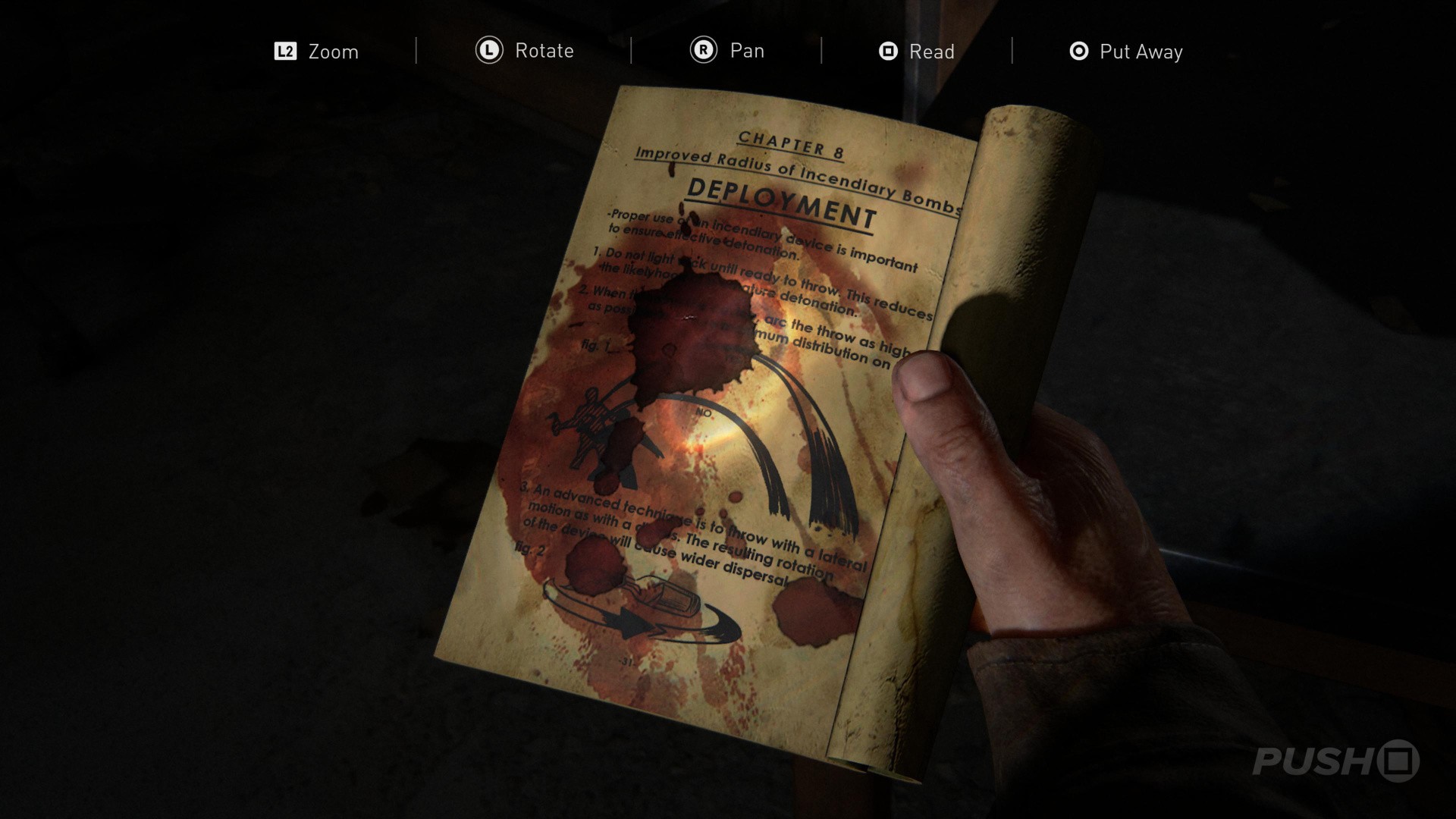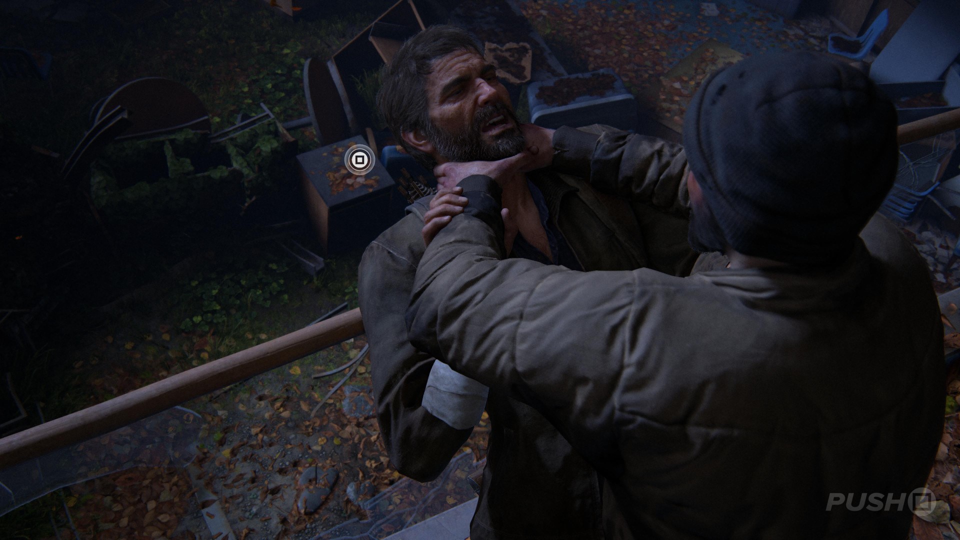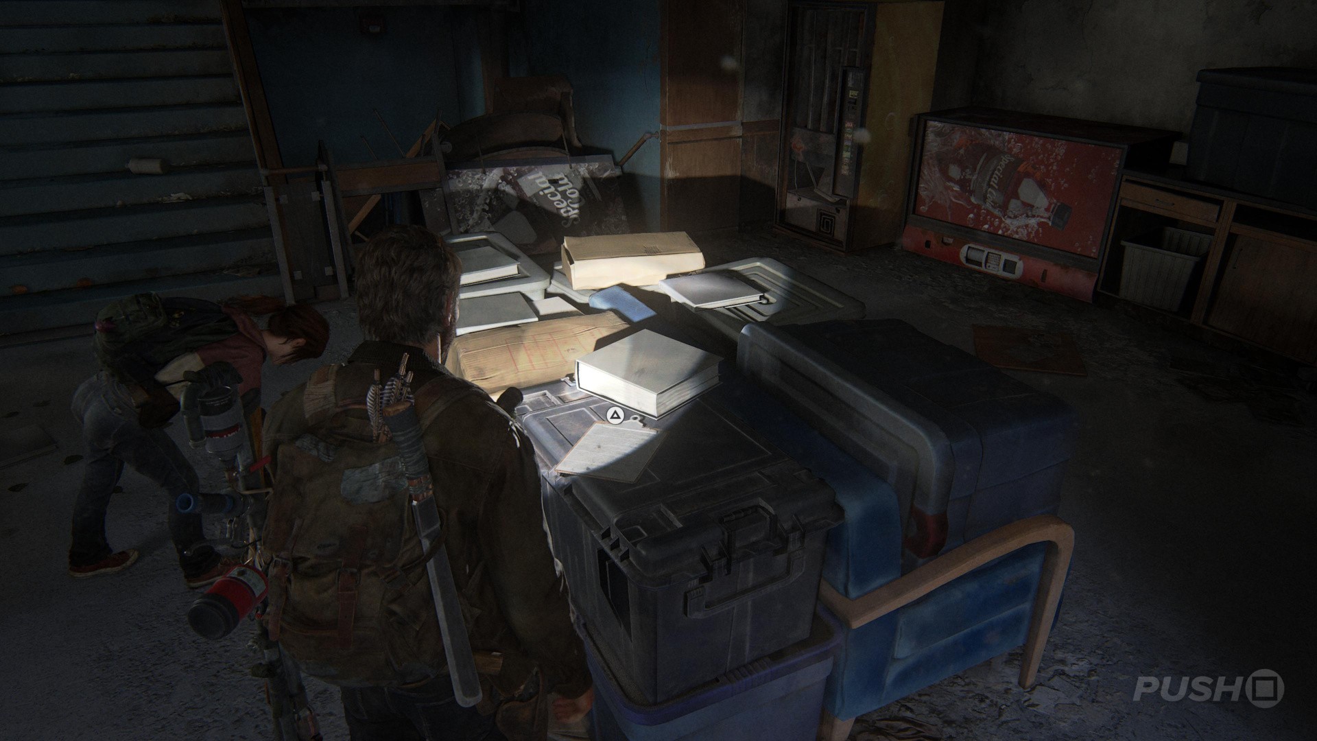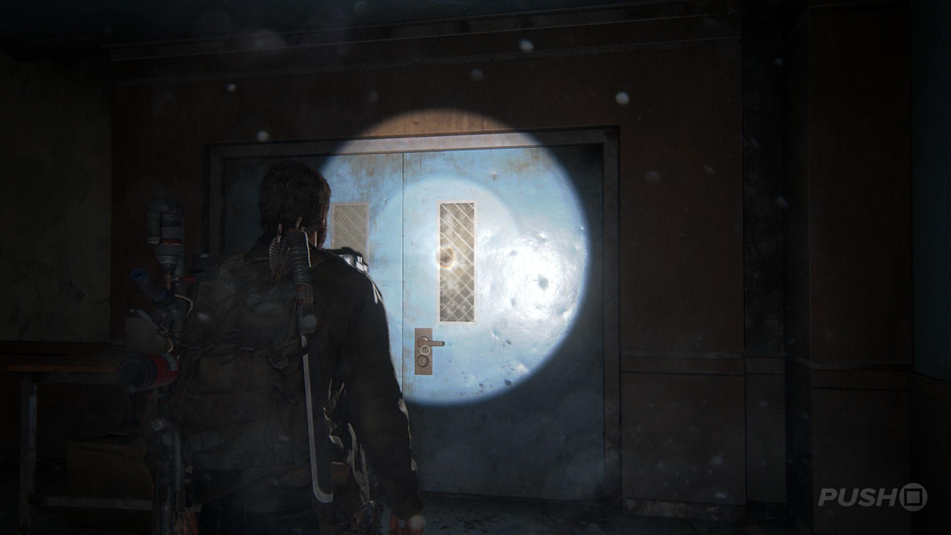 Well, you finally know where to find the Fireflies, but you're under attack. It's time to get out of the Science Building, and unfortunately you're going to have to fight your way to the exit. Remember to stay low, use cover, and pick off the bandits when they peek out. If you're not sure which way to go, then follow the flares down the stairs. You'll eventually come to a closed door, but be prepared when you open it, because you're going to get into a scuffle. Tap the square button to fight back.