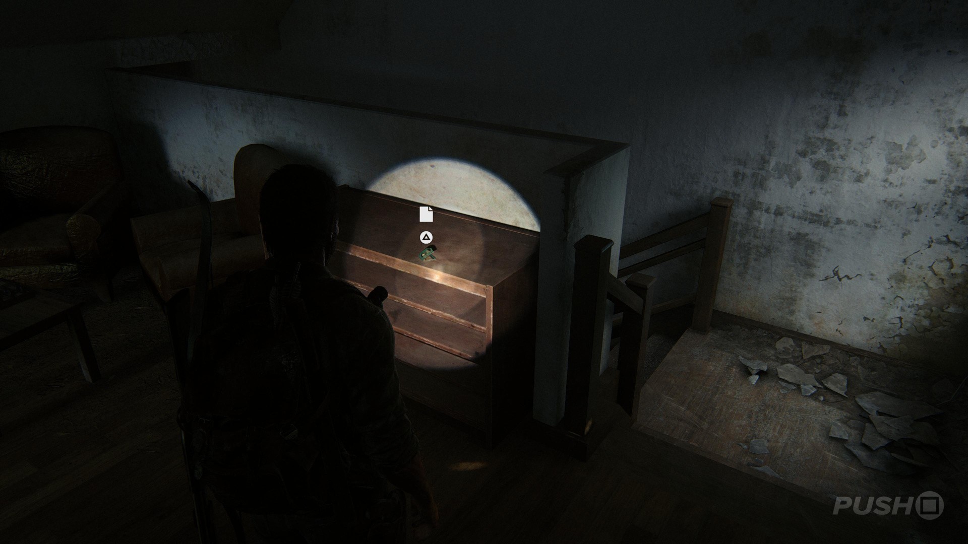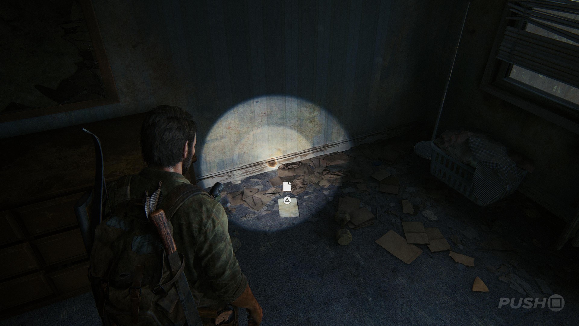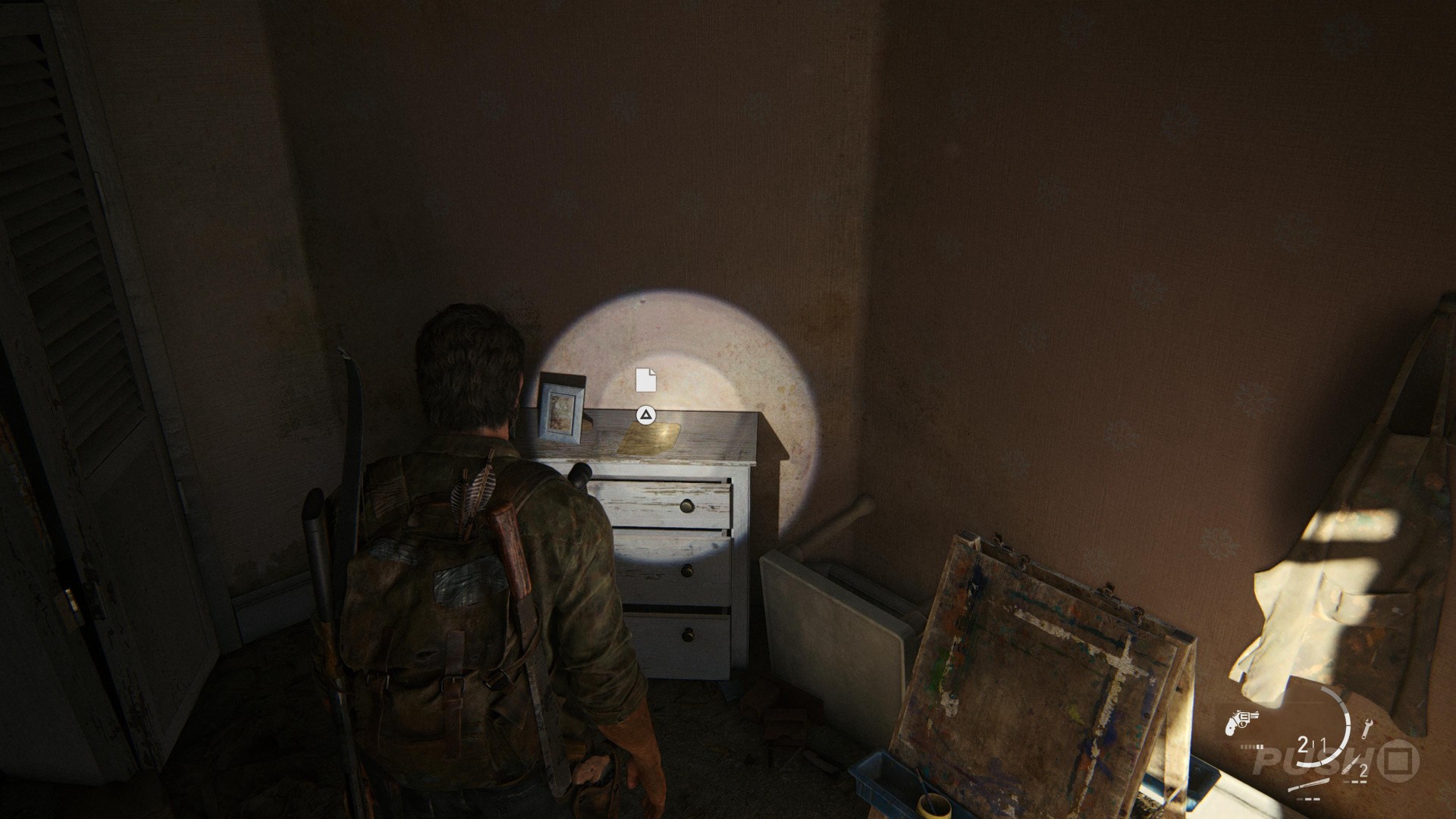 Move further down the street, to the house with the red graffiti on the front, and head upstairs. You'll find an Artefact on the floor next to a chest of drawers named Survivor's Note. This is next to a computer in The Last of Us and The Last of Us Remastered.