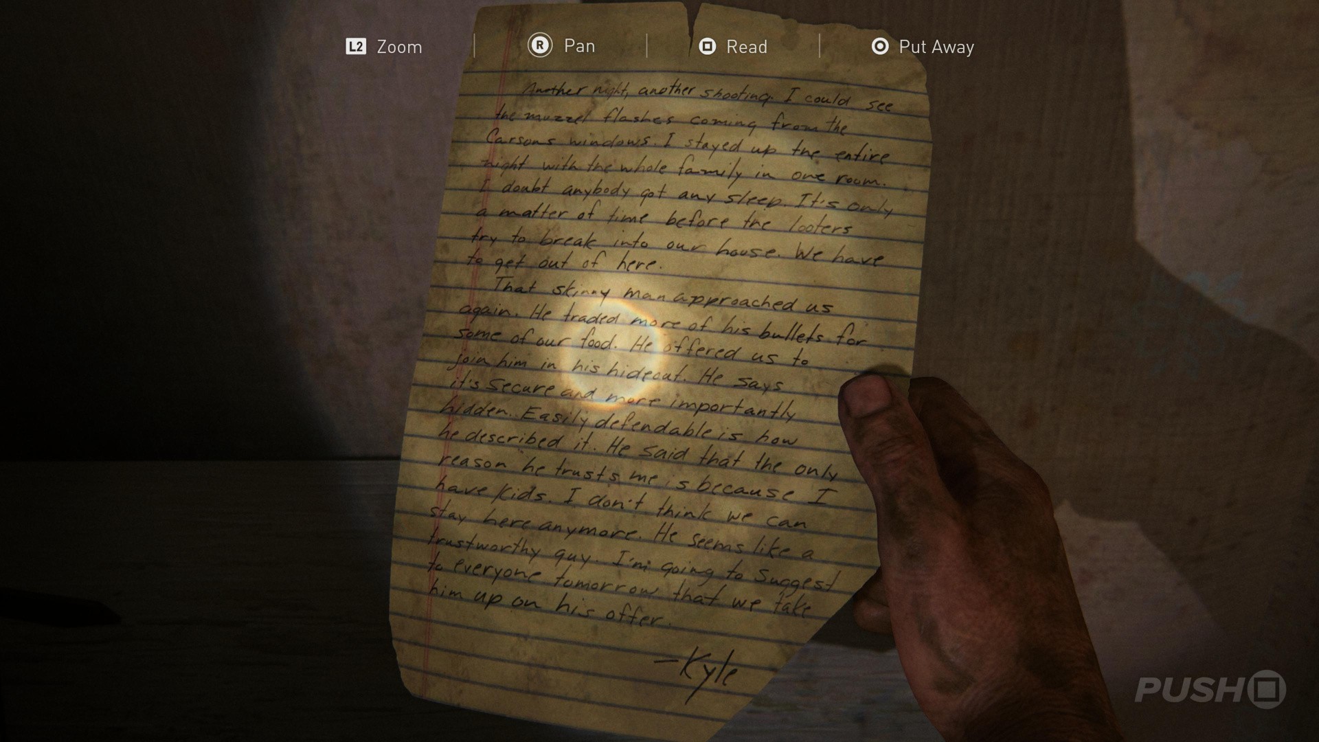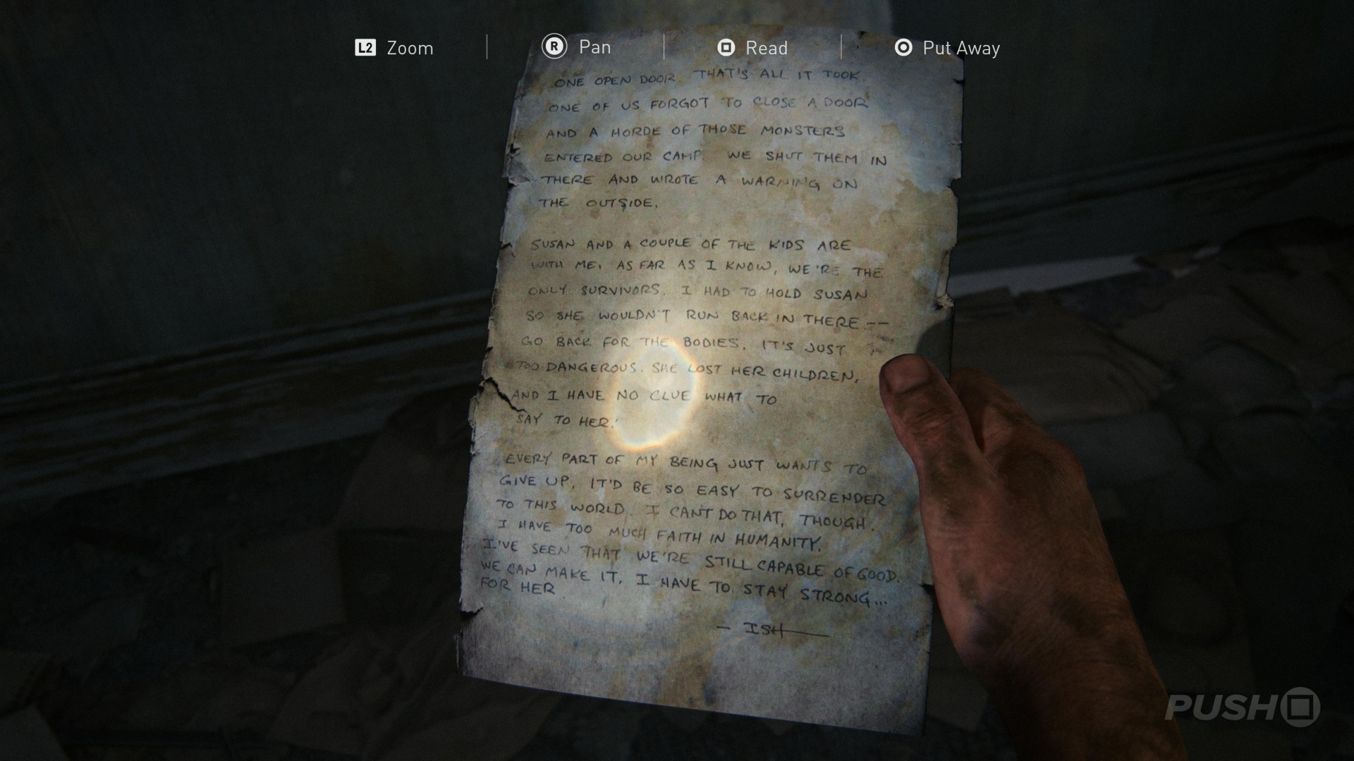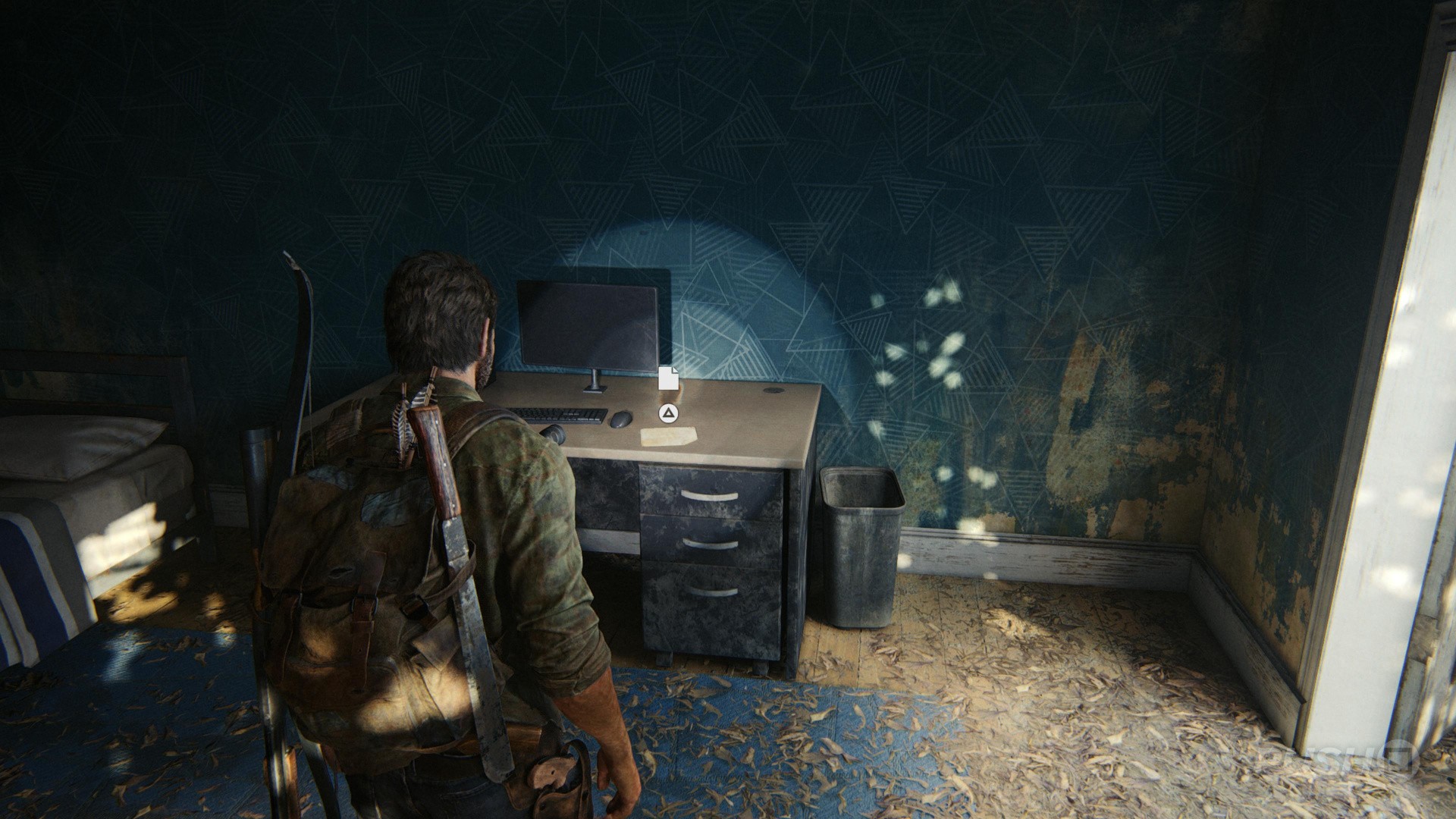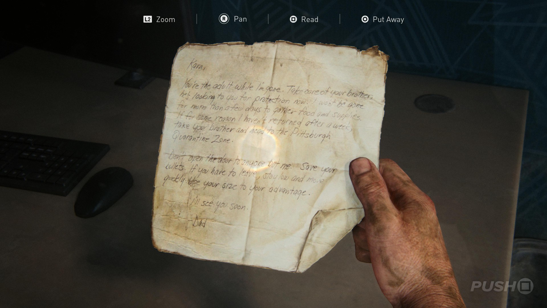 Move further down the street, to the house with the red graffiti on the front, and head upstairs. You'll find an Artefact on the floor next to a chest of drawers named Survivor's Note. This is next to a computer in The Last of Us and The Last of Us Remastered.