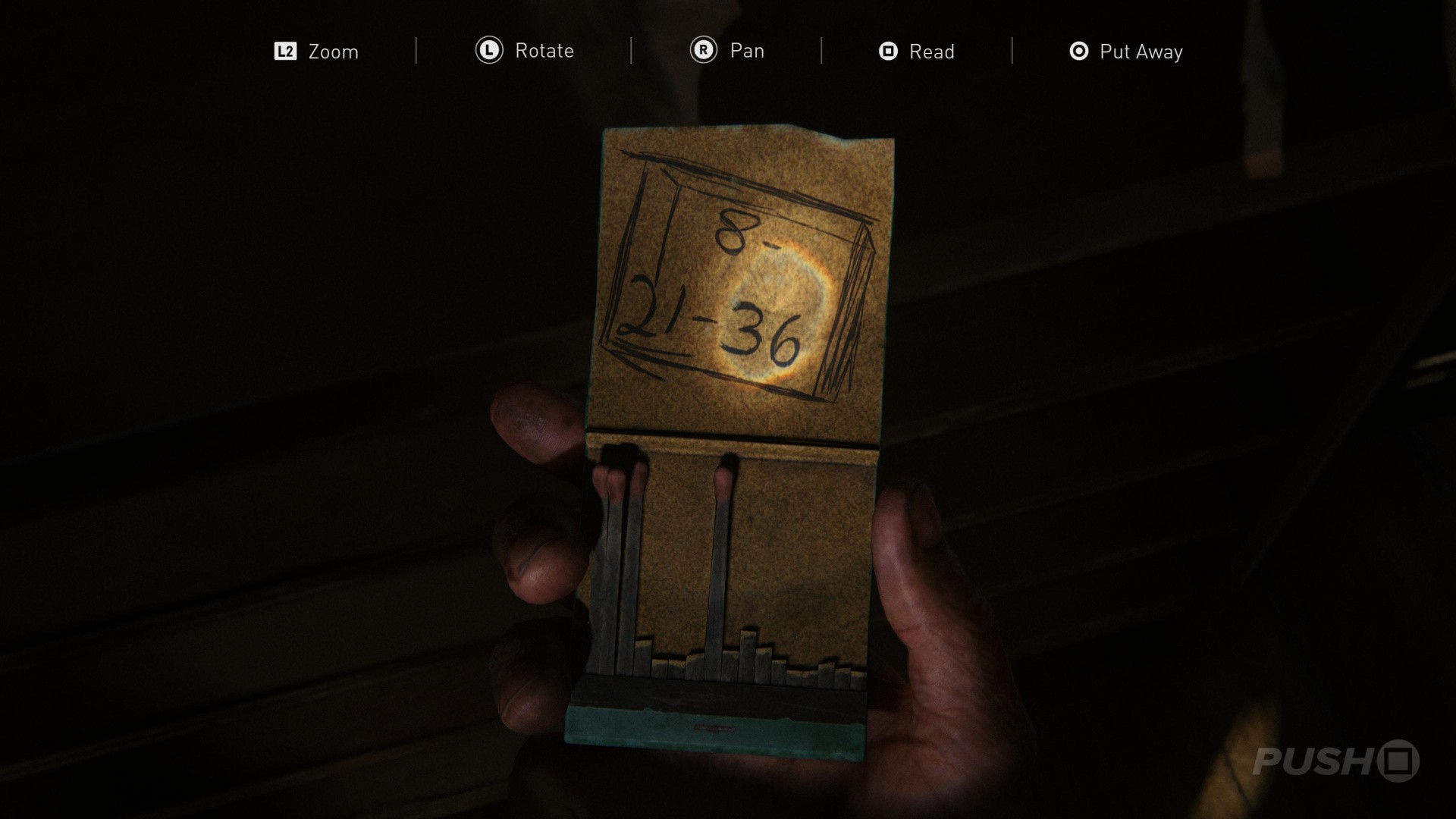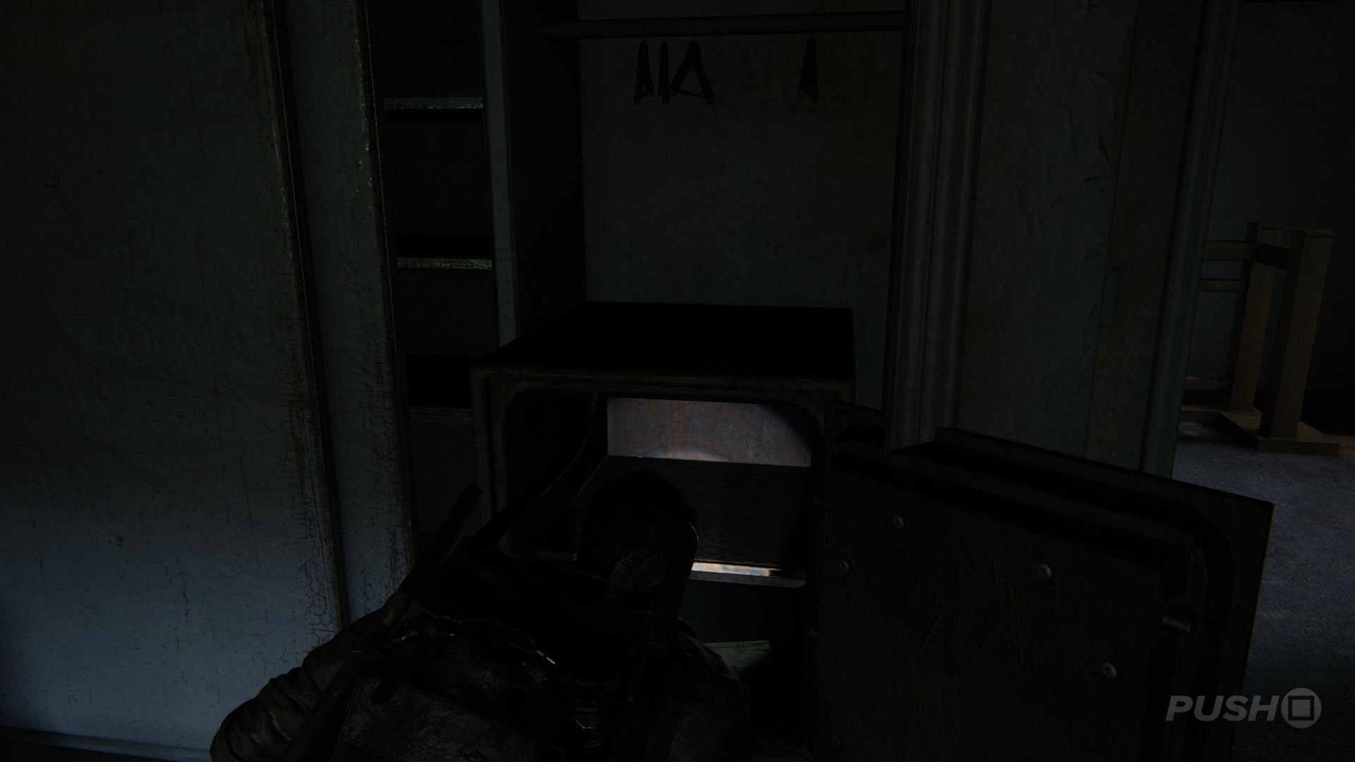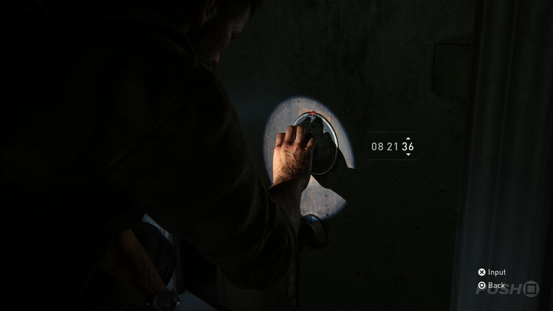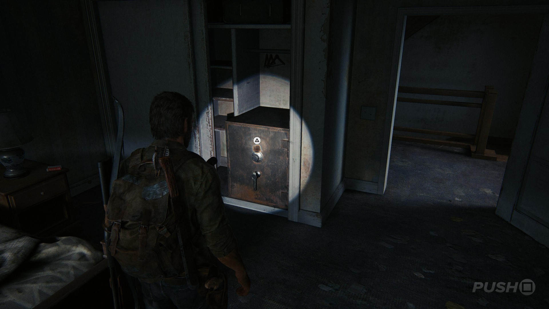 You may have noticed there was a Safe Code Combination on the Artefact you found on the top floor. Head back down to the master bedroom where you got Survivor's Note and look in the wardrobe for the Safe. The Safe Code Combination is 08-21-36. Loot the Supplements and Weapons Parts inside, and you'll unlock the Sticky Fingers Trophy if you've been following our The Last of Us guide.