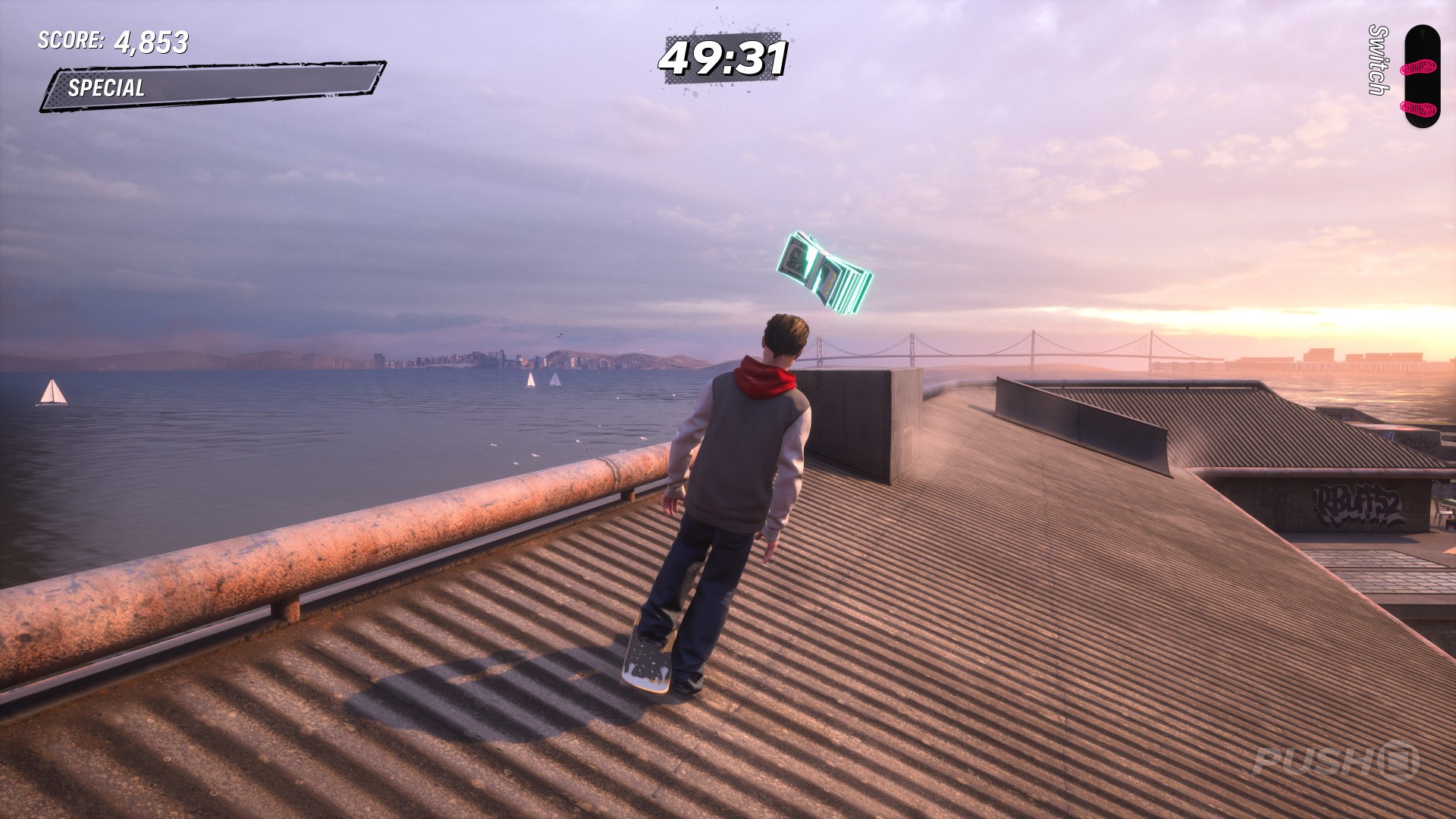 - On this lower level, there's a building ahead — get onto its roof using the quarter pipe. The Cash is up here.