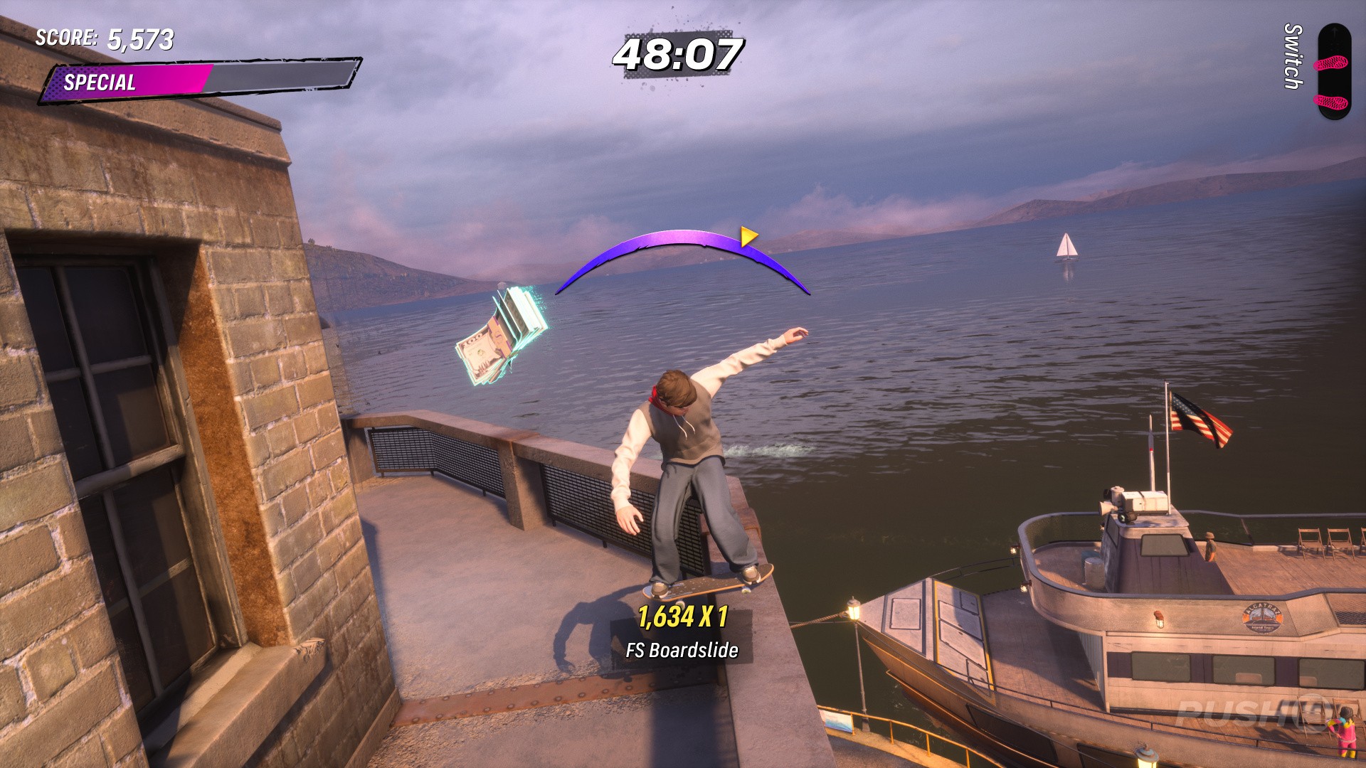 - Go back the way you came, back up to the lighthouse. There's a quarter pipe on one side of the lighthouse; use it to reach the Cash.