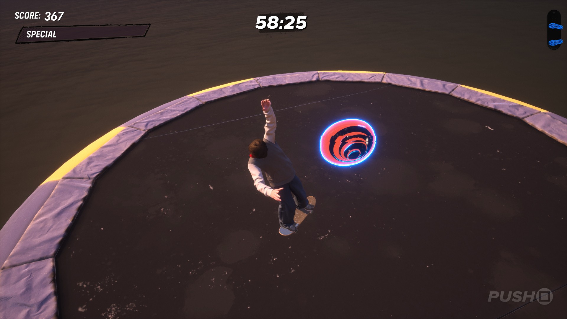 Up here, head to the far left corner and find a ramp leading into a loop-de-loop. Use it to launch onto a giant target, which has the Iron Galaxy logo at its centre.