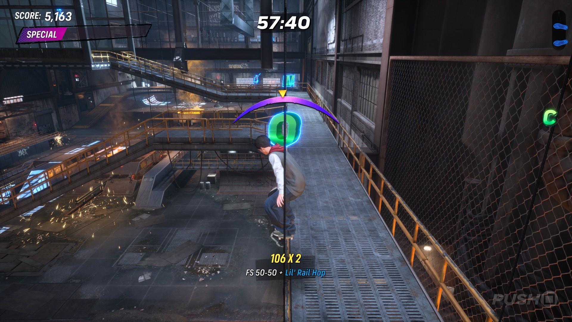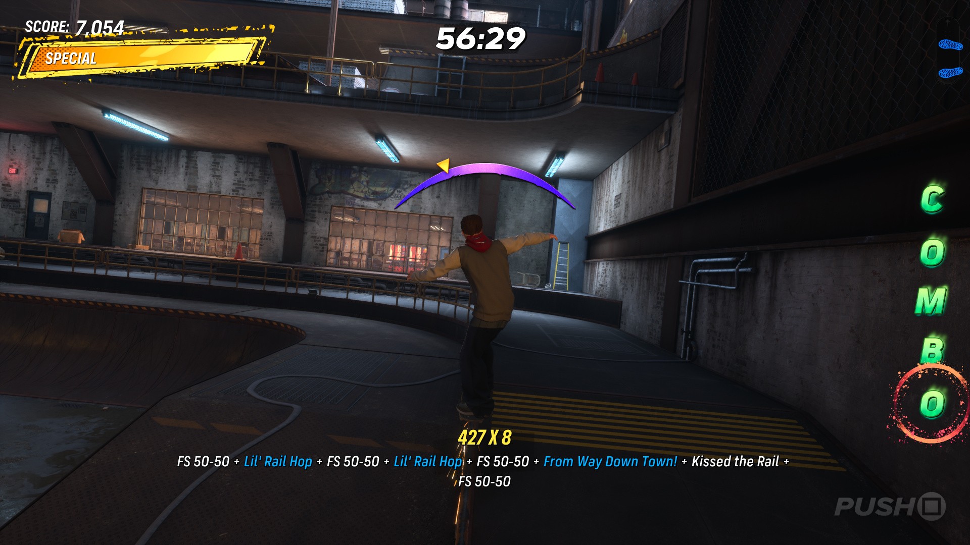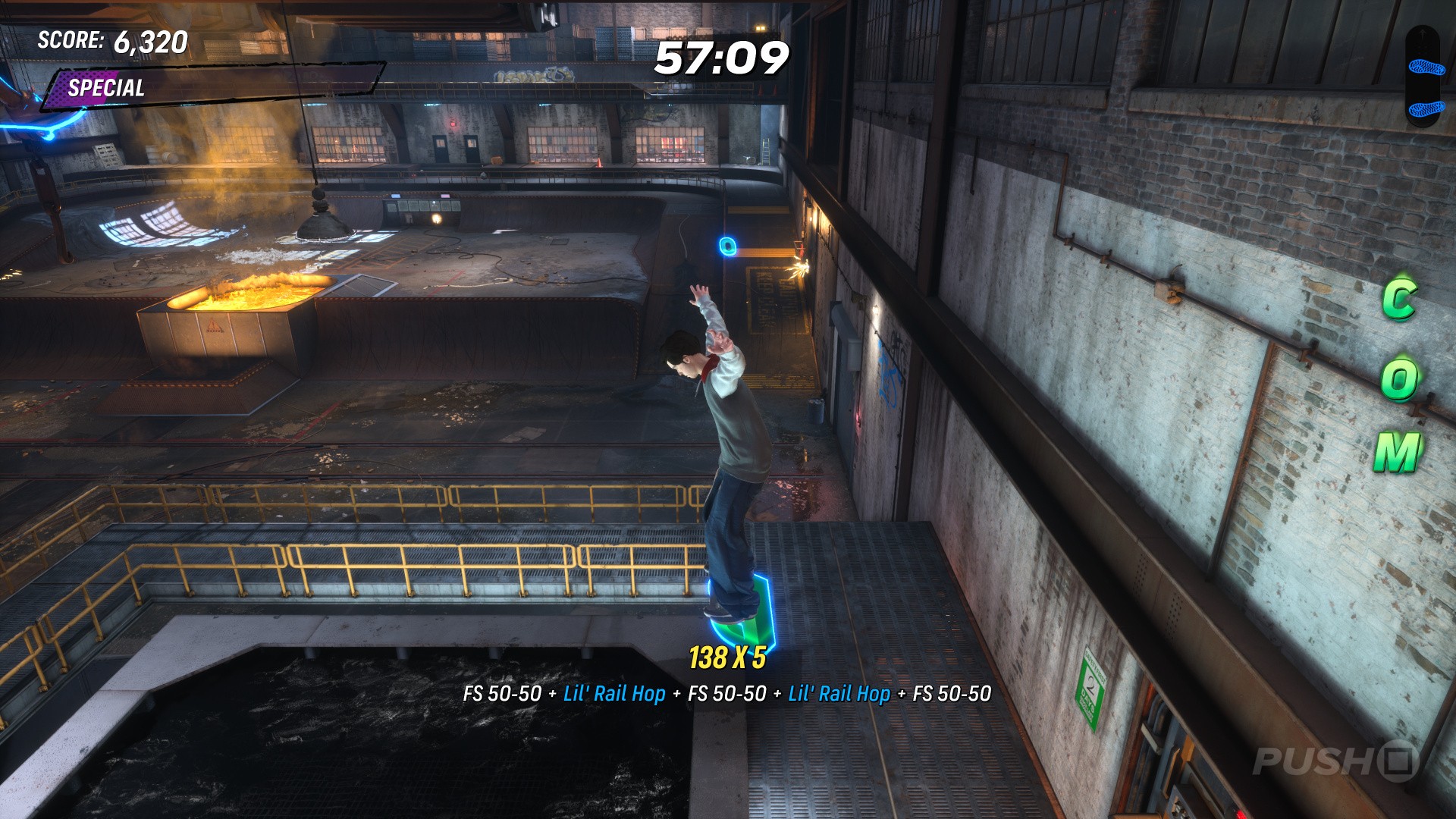 From level start, head right and jump onto the raised catwalk. The COMBO chain begins here — grind the yellow rails for the first three letters, then jump off the end of the catwalk and grind again for the next letter. Jump off at the end and grind the rail ahead for the final letter.