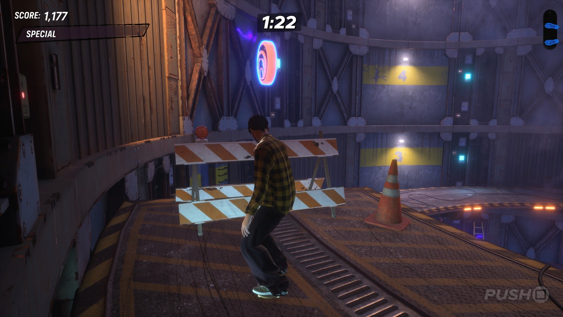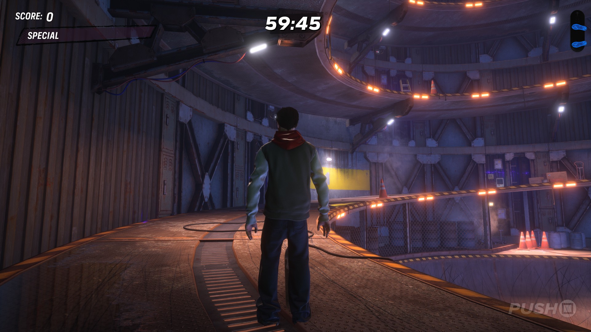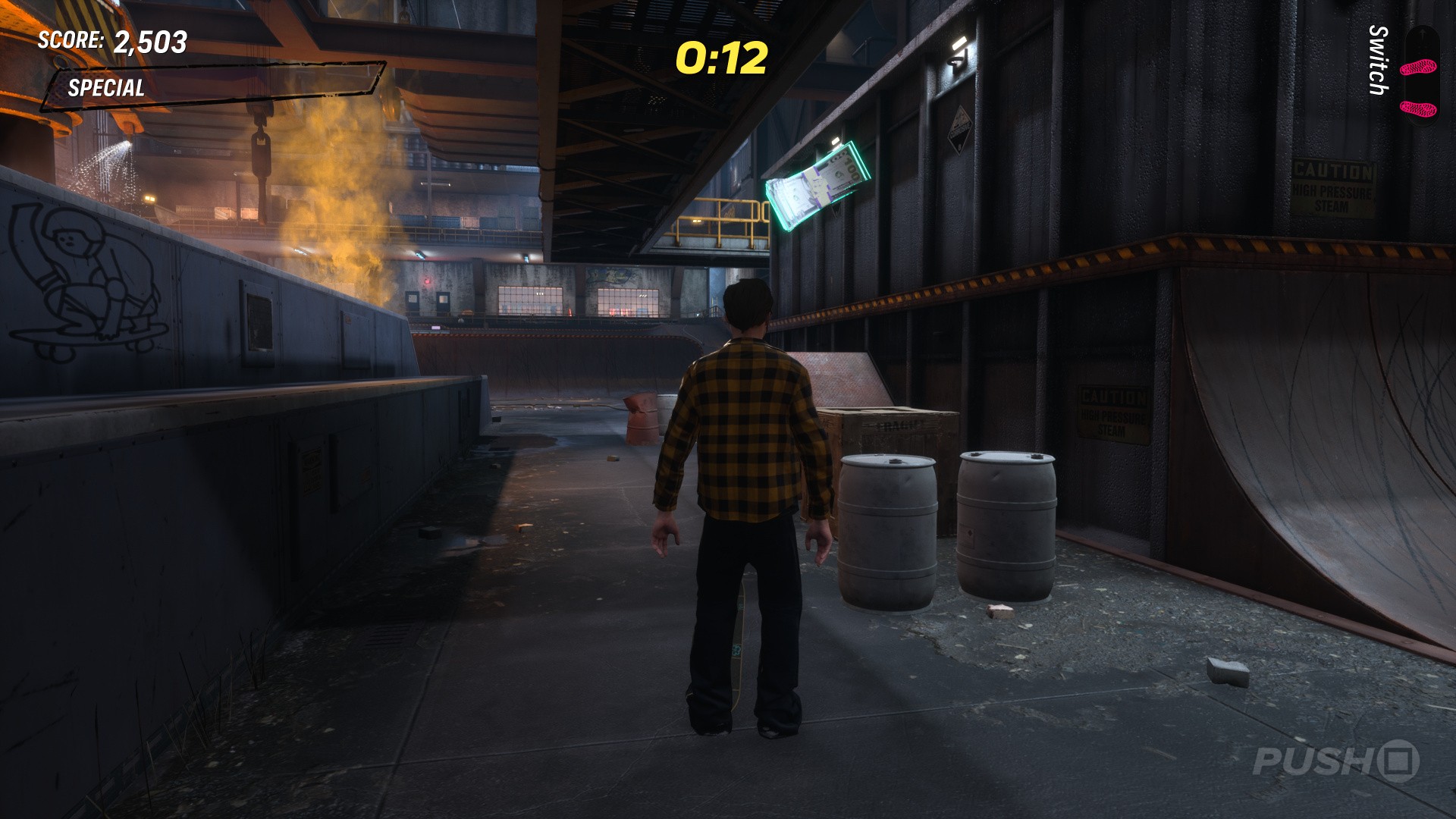 From level start, head right and jump onto the raised catwalk. The COMBO chain begins here — grind the yellow rails for the first three letters, then jump off the end of the catwalk and grind again for the next letter. Jump off at the end and grind the rail ahead for the final letter.