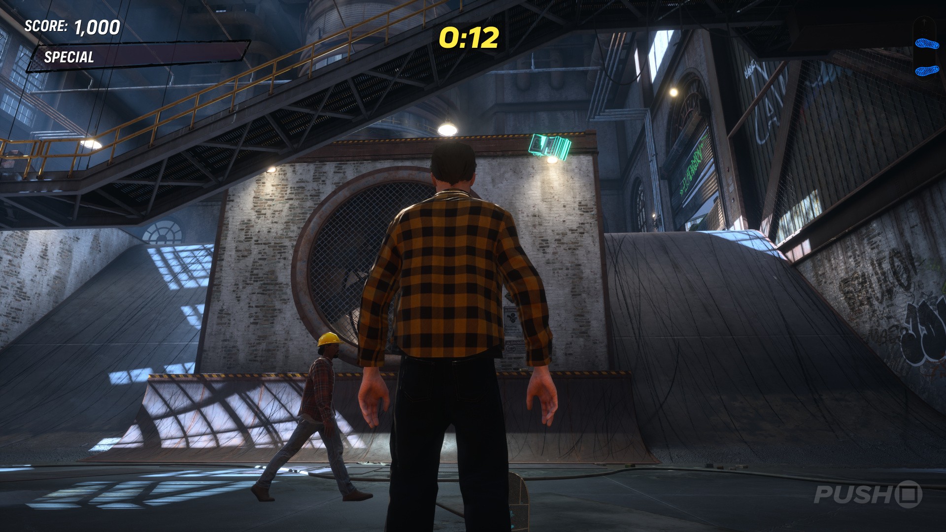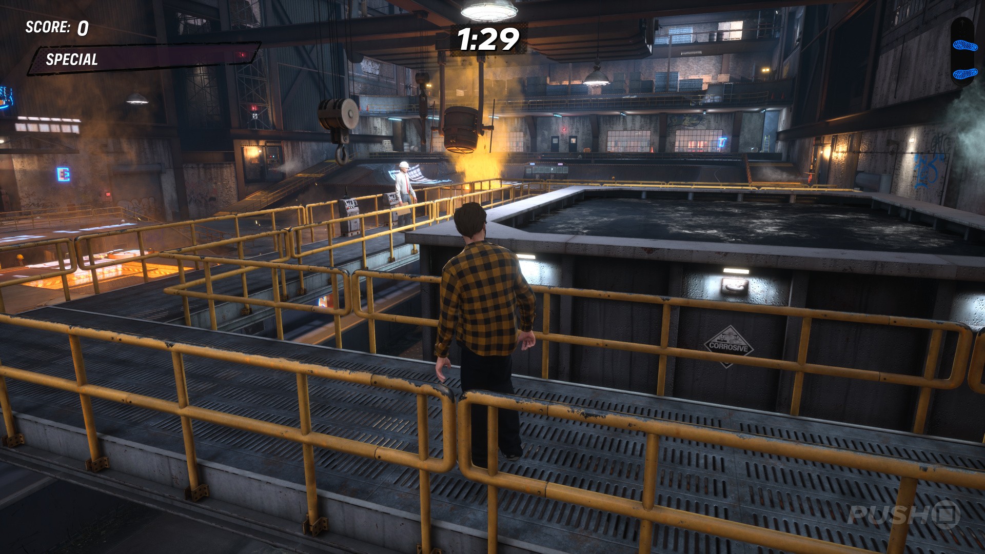 Go past the big half pipe on the right-hand side and up the ramp to find the foreman beside some water. Grind the rail behind him and you'll trigger this goal.