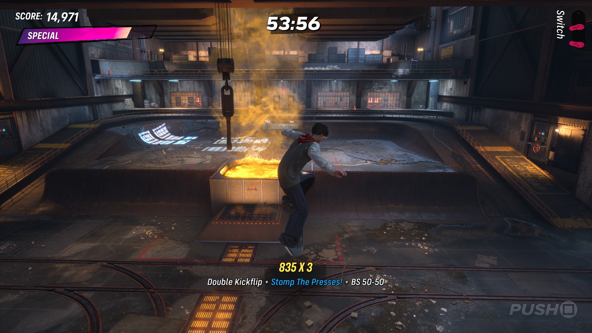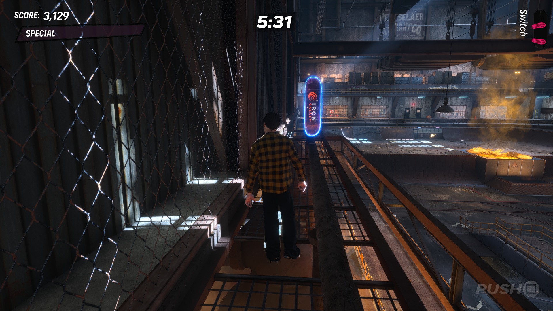 Near the back of the level is a pit of molten hot metal, and a large bucket periodically will pour more from above. As it's pouring, use the kicker ramp on the edge of the pit to reach the bucket, which has a rail on either side; grind one of the rails to complete this goal.