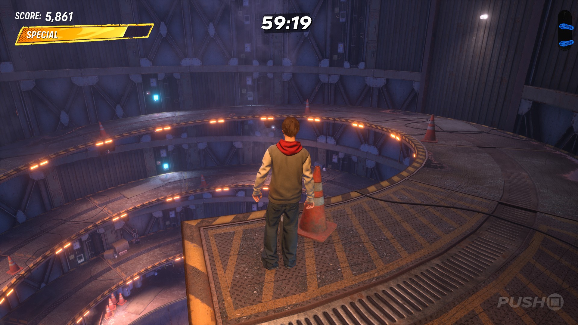 From level start, turn around and go inside the room with the spiral slope. Build up your special meter, then go up the spiral to the very top. You need to perform a Froggy Grind all the way from the top of the spiral to the bottom, and land the trick.