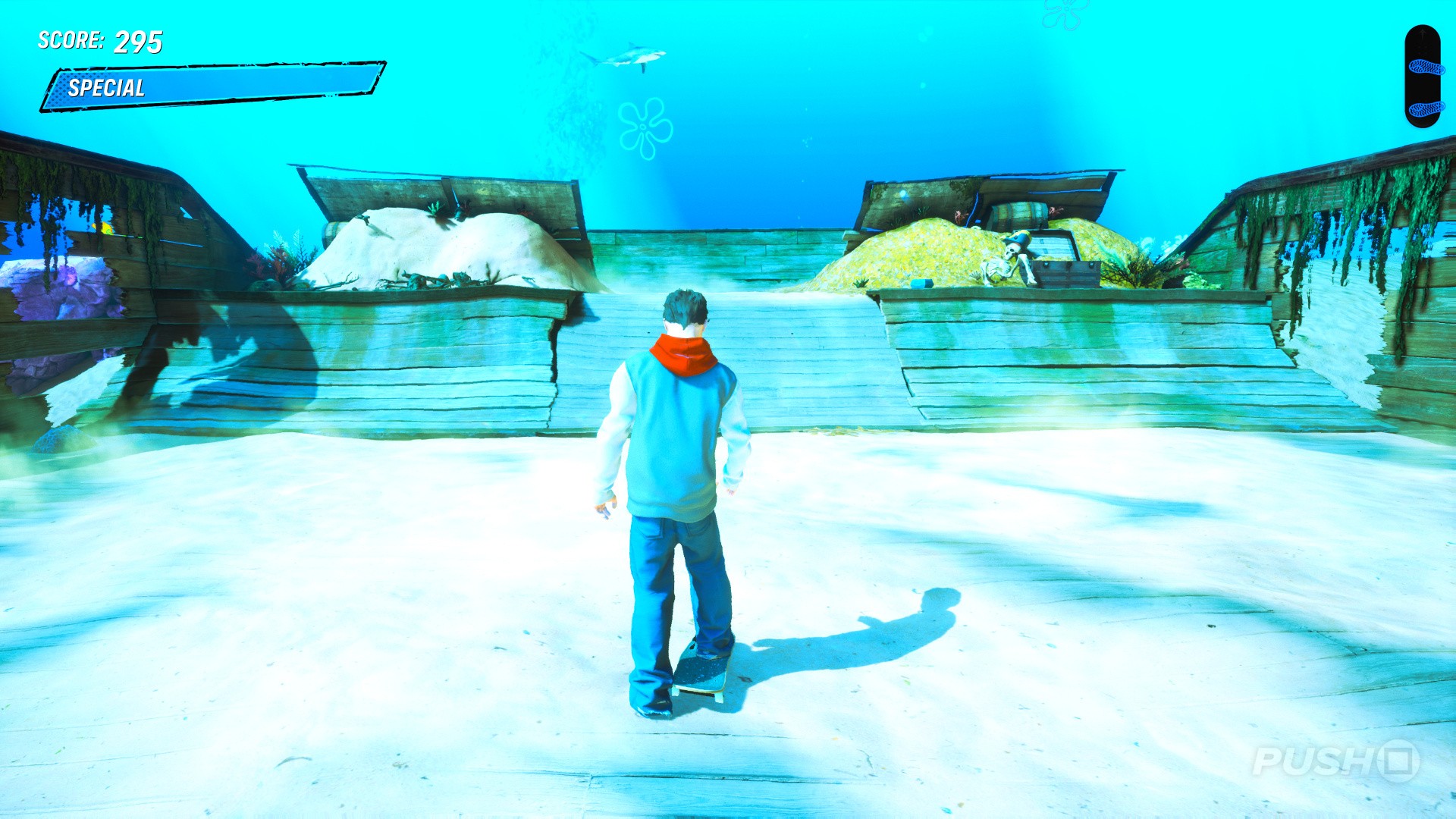 While it looks great, the SpongeBob-themed secret area is quite small. Obviously there's that great view of SpongeBob, Patrick, and Squidward's houses, but you can't go there. You can only use what's on the shipwreck you land on; a few quarter pipes and some ramps that lead you back to the main level. Still, it's a really fun hidden area.