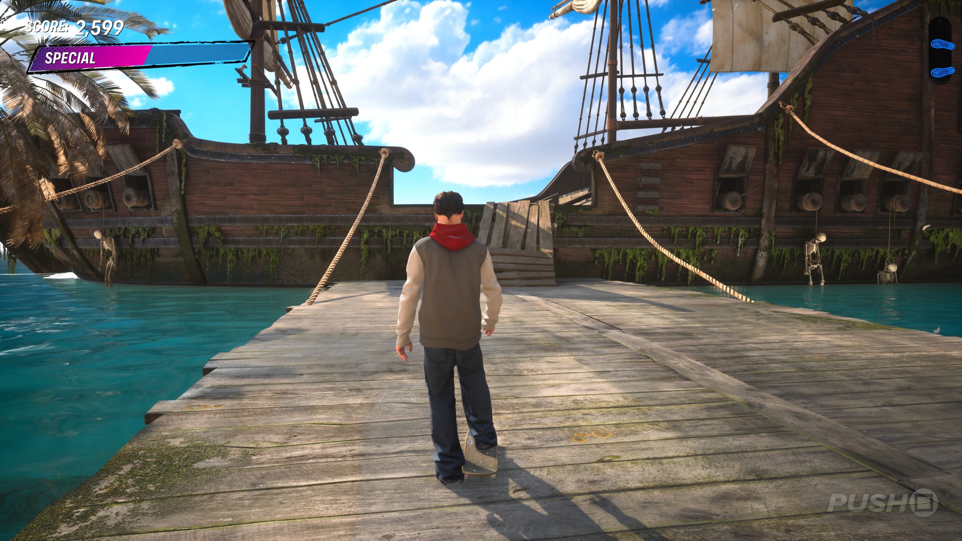 - Ahead is a pirate ship — go aboard and head left to the ship's bow.