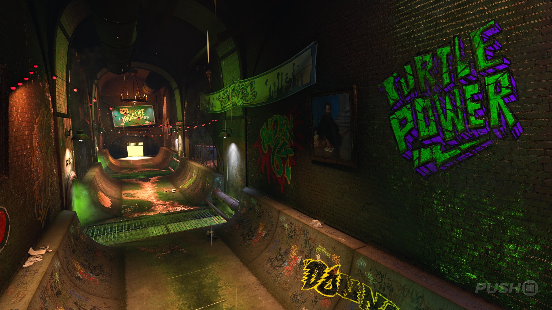 The sewers secret area is a direct reference to Teenage Mutant Ninja Turtles, which makes sense seeing as Michelangelo is one of the game's Bonus Skaters. Anyway, the area itself is pretty small — just a corridor lined with quarter pipes before funnelling you back out to the level proper. It's a fun Easter egg, all the same!