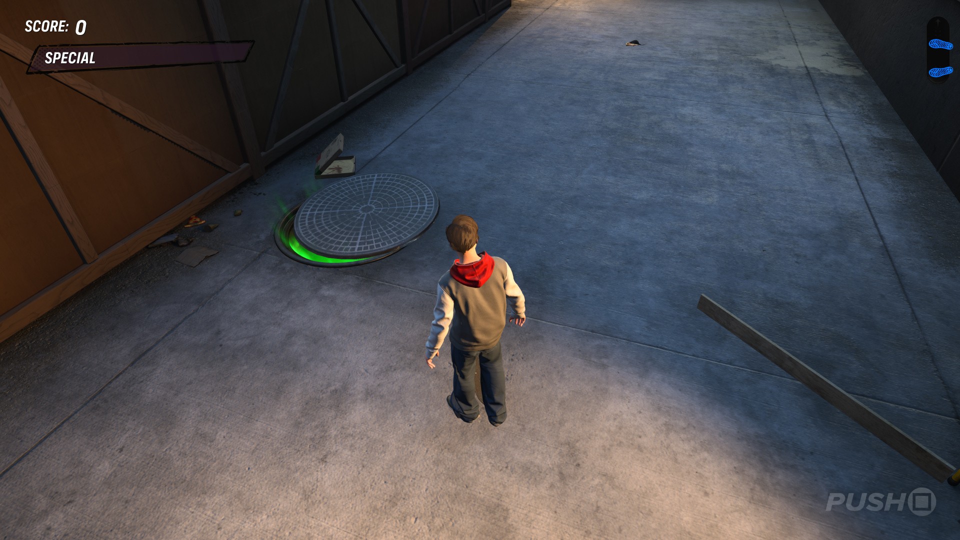 - Go behind it to find a manhole cover, with a mysterious green glow emanating from it.
