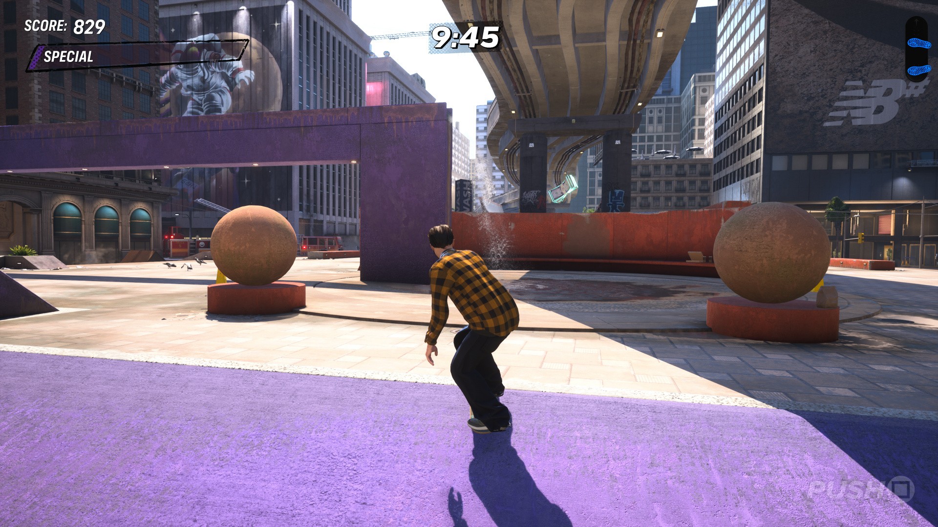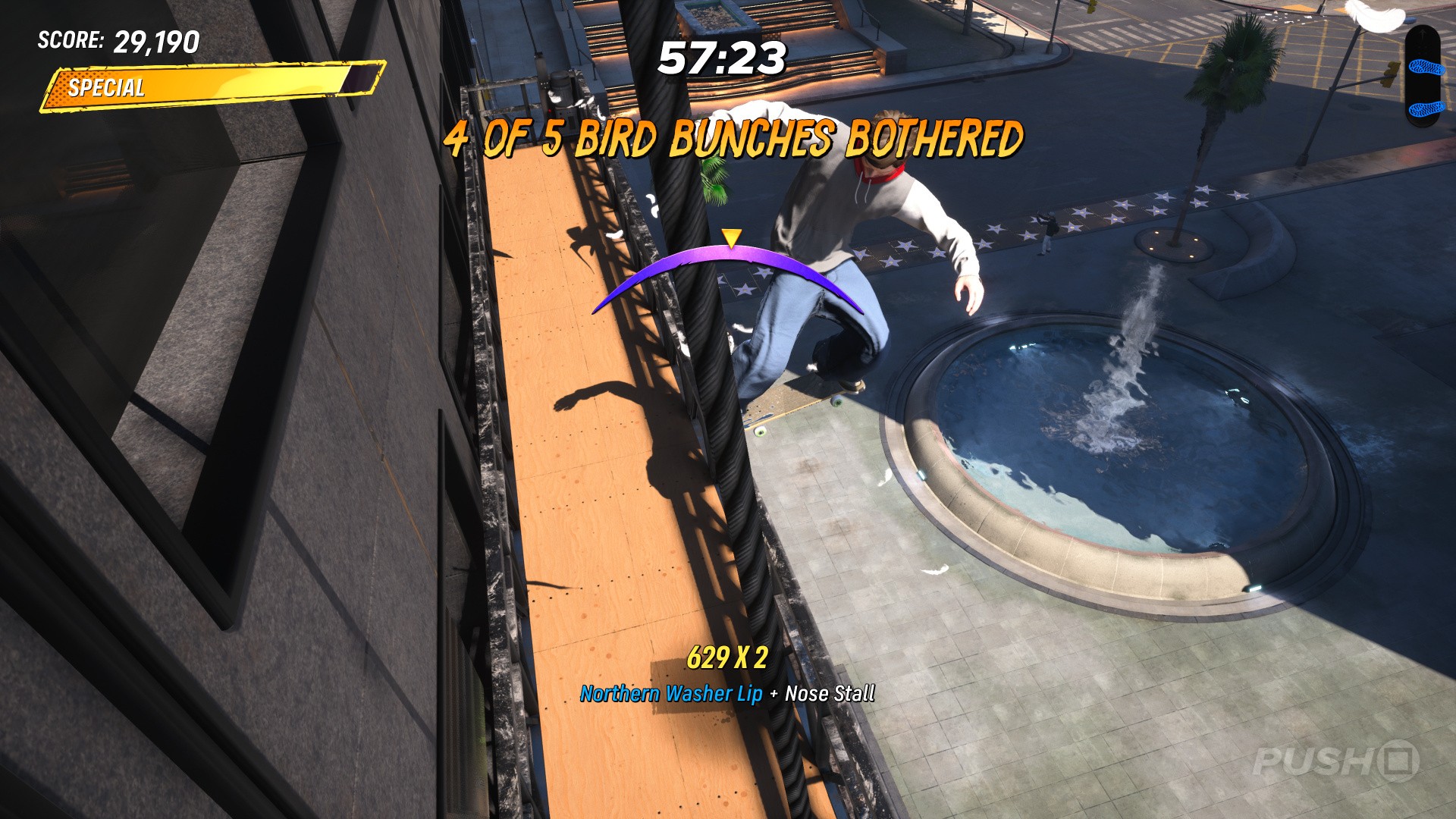 - Go to the fountain and use the quarter pipe to reach up to the ledge above, performing a grind or lip trick to get the seagulls.
