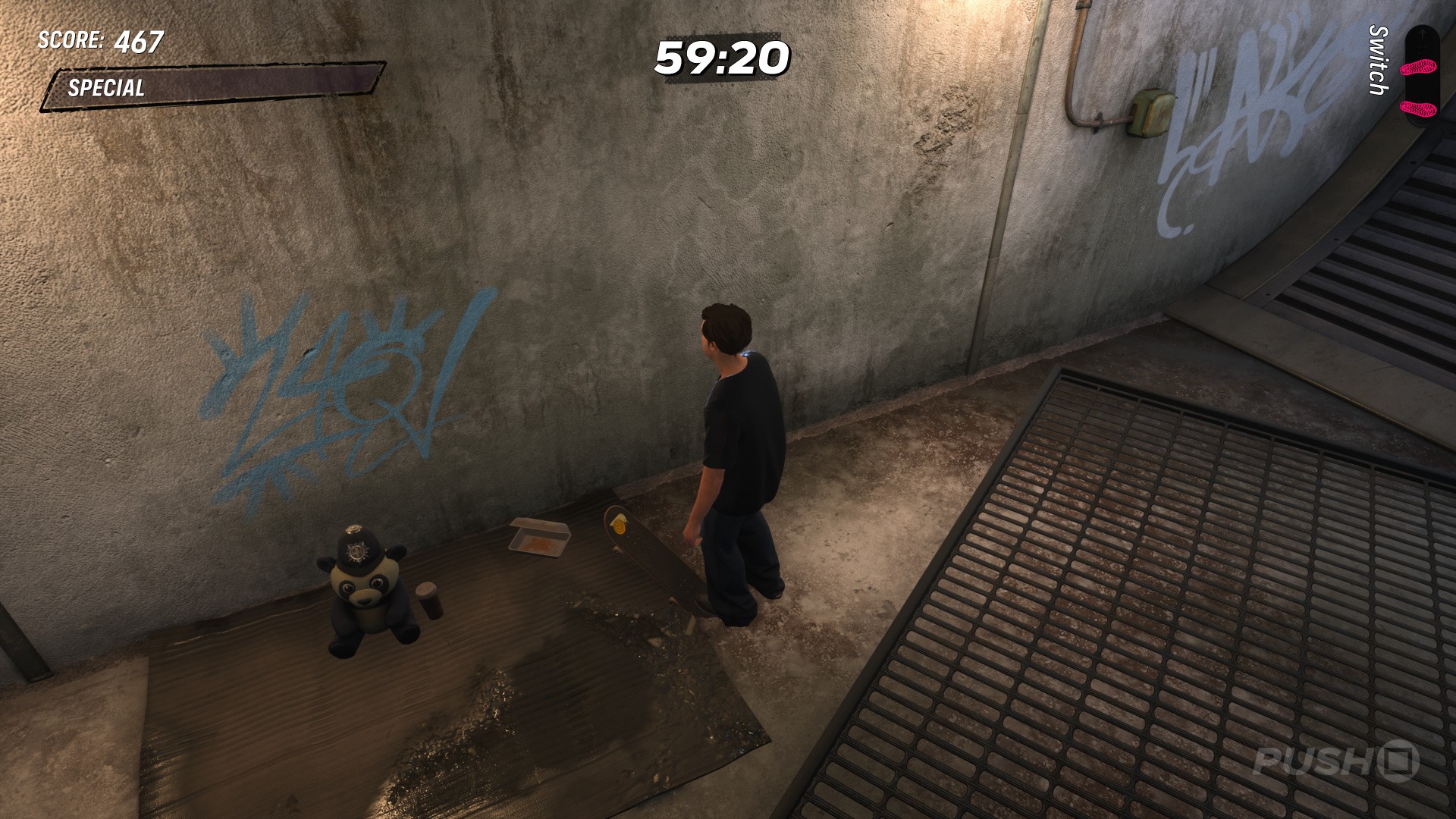 From level start, go to the right where you can find a couple of quarter pipes covered up by grates. Grind the ledge in the corner to complete the Gap called They're Grate! — this will open them up. Drop down and inside you'll find the Panda Plushie.