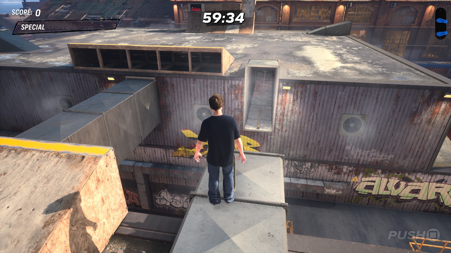 From level start, go left and then right between the buildings. Go in the door leading to 'Rooftops'. Up here, use the ramp to jump over to the other rooftop, performing an Ollie North as you go.