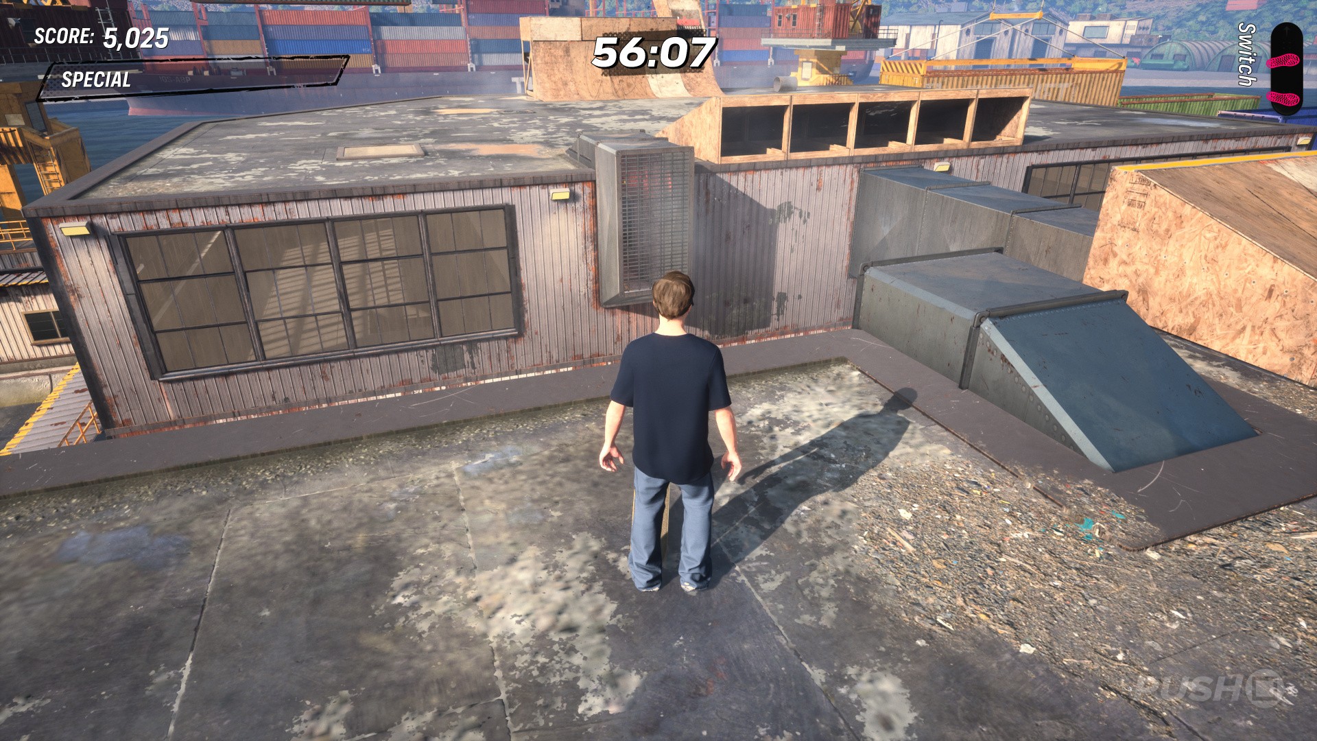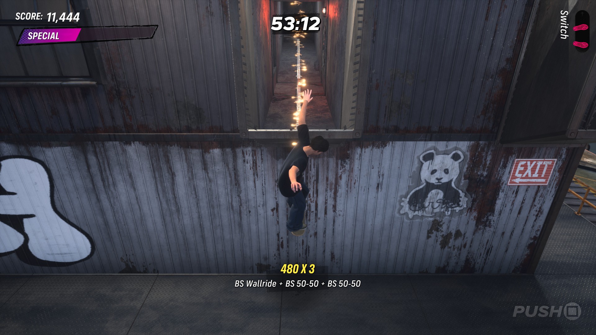 - The previous vent rail leads to the containers. Get into the yellow container to the right. Turn to face the building you came from. Wallride up the left side of the container and grind its top edge, hop to and grind the light blue container, and jump at the end to reach the final vent rail.