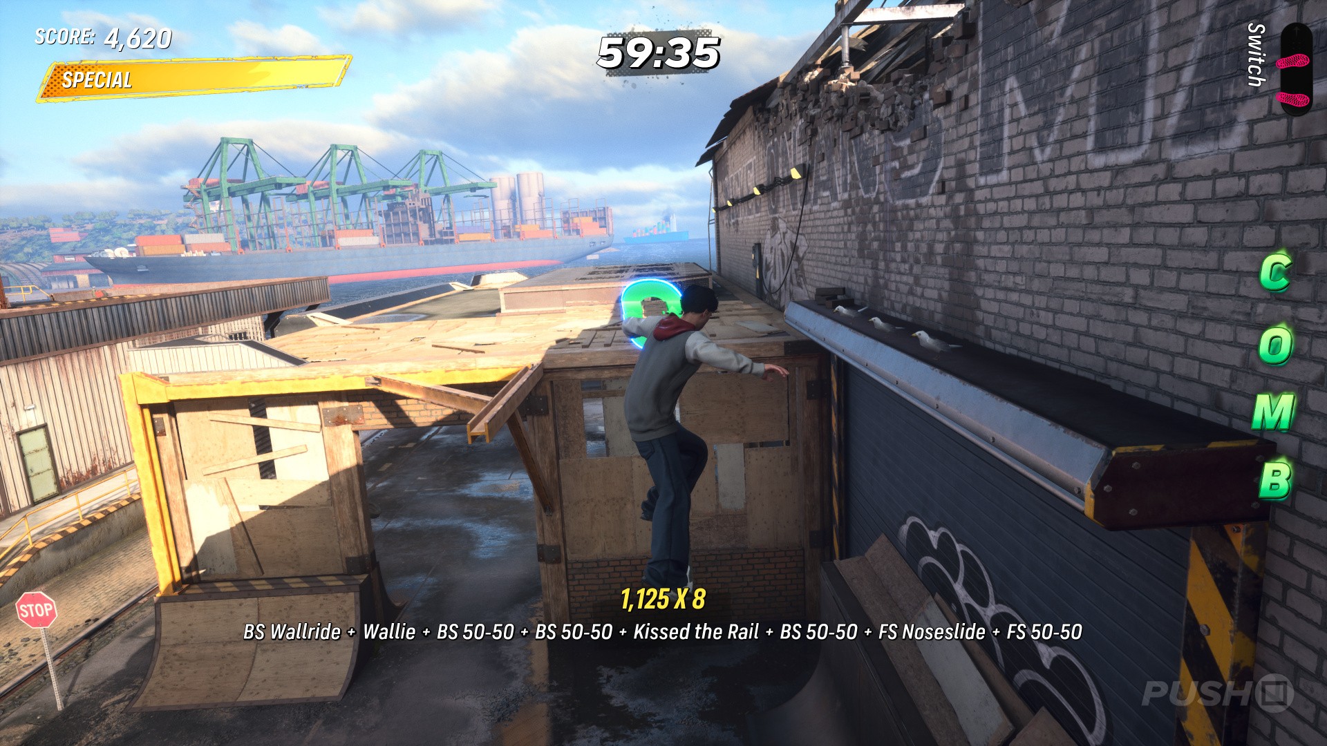 The COMBO chain begins just to the right of the start point. Grind the container, then the ramp, then the rail the other side, then hop right to the next rail, and jump off the end to get all the letters.