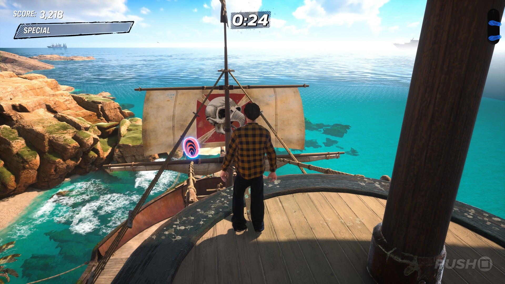 From level start, go left to the outside area with the pirate ship. Board the ship and use the quarter pipe to the left to get up and lip trick on the mast, where you'll see a pirate skeleton.