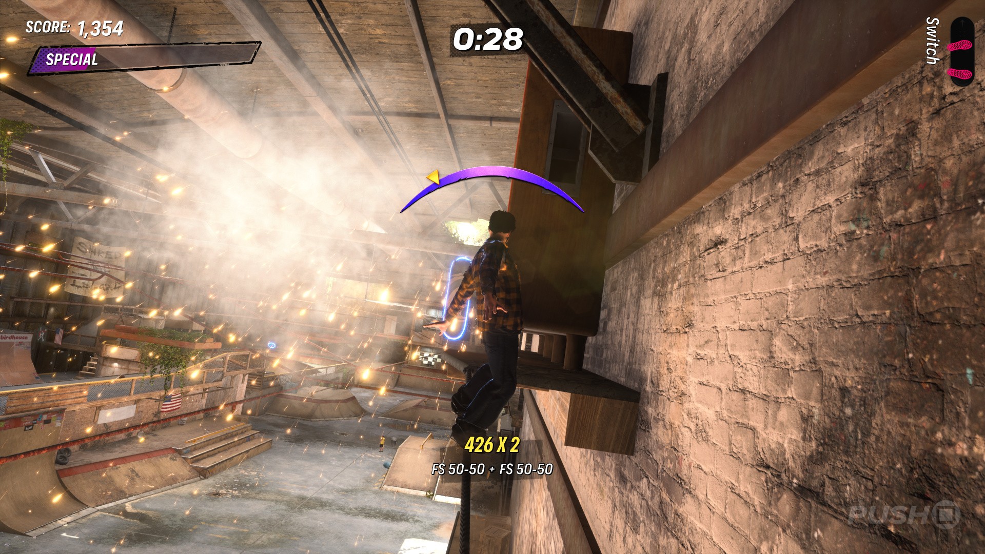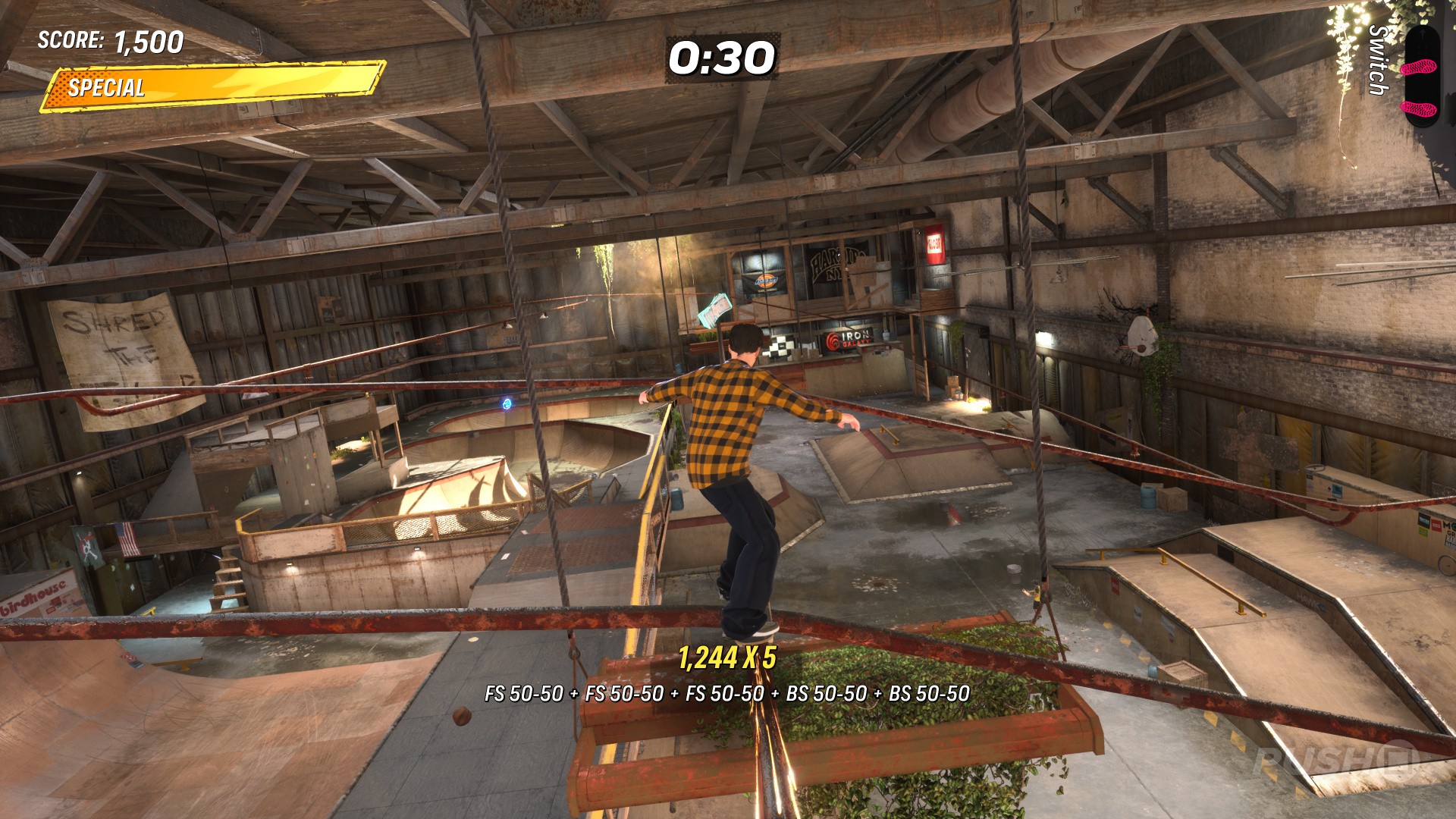 - From level start, head forward to the back of the park. Go up the left-hand corner quarter pipe and grind the rail above to the right. Hop to the next rail on the right and grind it all the way to the Cash.