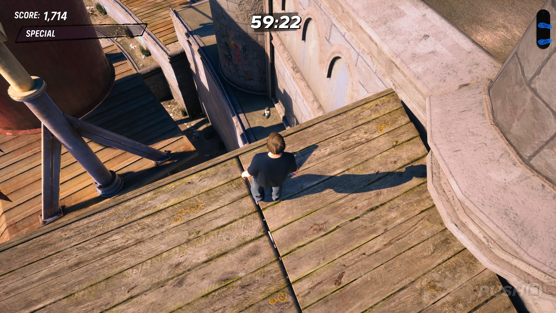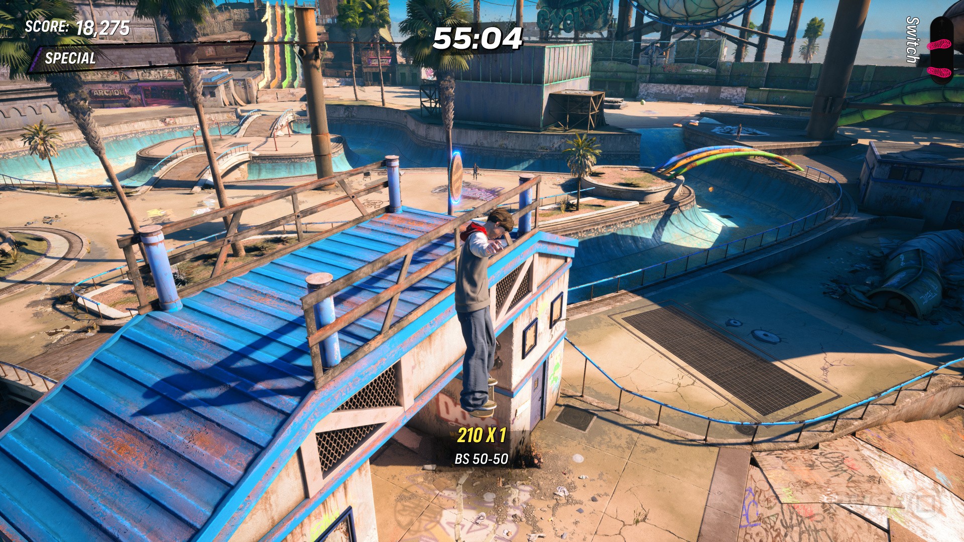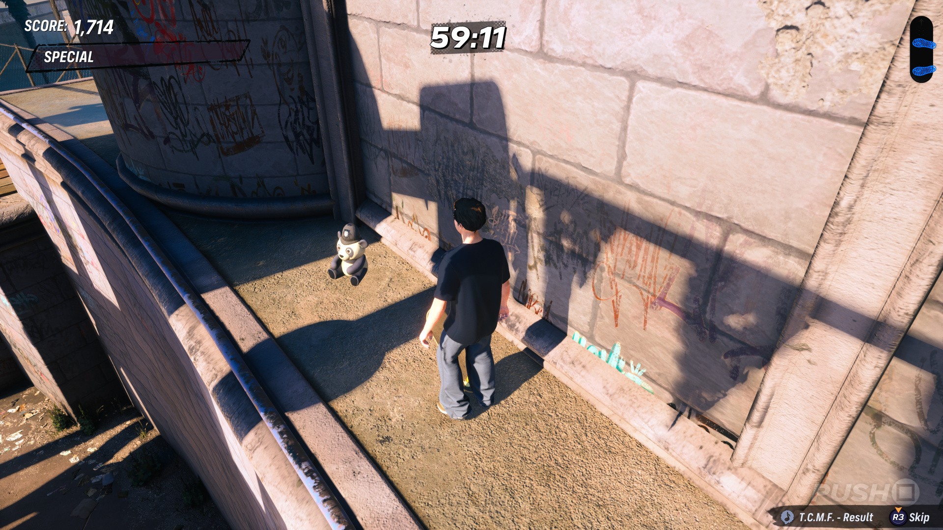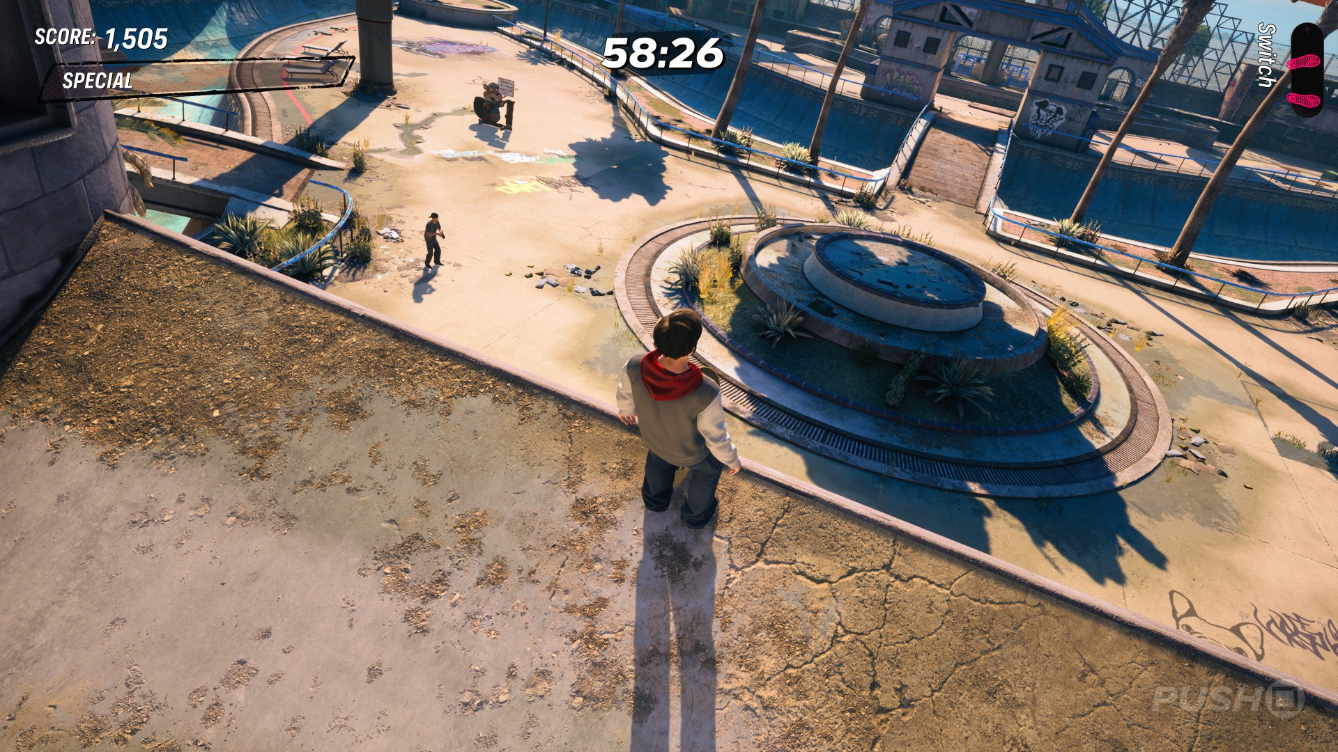 - From there, drop down and follow the path under the arch. On the left is a quarter pipe up a small ledge; use it to get onto the left-hand roof. Then, turn around and jump to the blue roof to get the Cash.
