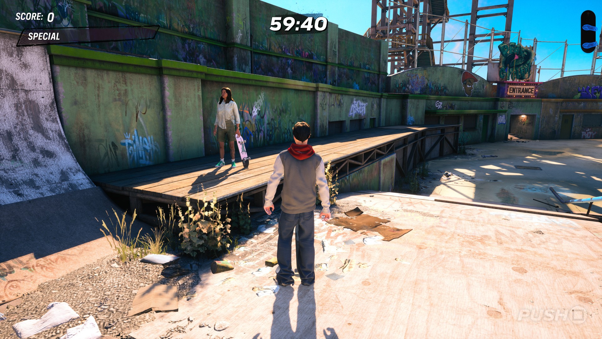Throughout the level are 7 skateboarders that you need to impress with your skills. Get a decent score in front of them to impress them.