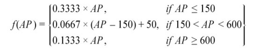 I graphed the function shown above, and the result is 3 lines with slopes of .3333, .0667 and .1333. Which basically means that up until the 150 threshold, AP increases at the highest rate. After you reach 150, AP continues to increase but at a slower rate. If you reach 600, AP will increase at a slightly higher rate than before, but not near the rate of your first 150.