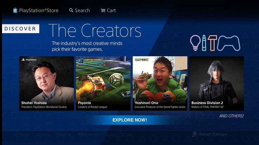 Sony appears to have launched a brand new PlayStation Store feature in the US. Dubbed 'The Creators', this fresh section allows for developers and other industry figures to recommend their favourite titles. Right now, Resident Evil 7 director Koshi Nakanishi is on there, along with Rocket League studio Psyonix, Inside dev Playdead, president of PlayStation Worldwide Studios Shuhei Yoshida, and more.