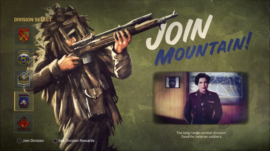 The one we selected, Mountain, is for snipers. When you ADS, you’ll receive extra aim assist and the area around your scope will be blacked out for focus. As you play with this class, you’ll level up with it and unlock new abilities like silent movement, being invisible on enemy radars, and a new weapon. The Infantry Division is for assault rifles and automatically equips them with a bayonet. You’ll eventually unlock the ability to have more attachments and ammo, too. However, should you decide you want more ammo and attachments for your SMG, the bayonet will not be applied to the weapon. The first benefits of each Division are weapon specific, so you’re somewhat discouraged from choosing Divisions that run counter to their weapon class counterparts.