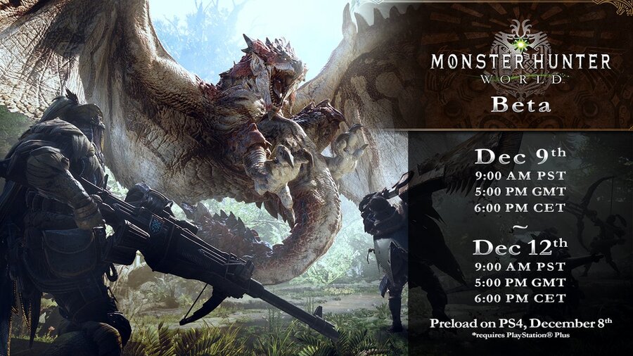 Get your creature slaying gang together: Capcom's dated the highly anticipated Monster Hunter: World beta. The test's set to start on Saturday 9th December, which is just over a week away, in case you're wondering. It carries through to Tuesday 12th December, so you'll have around three days to get stuck in.