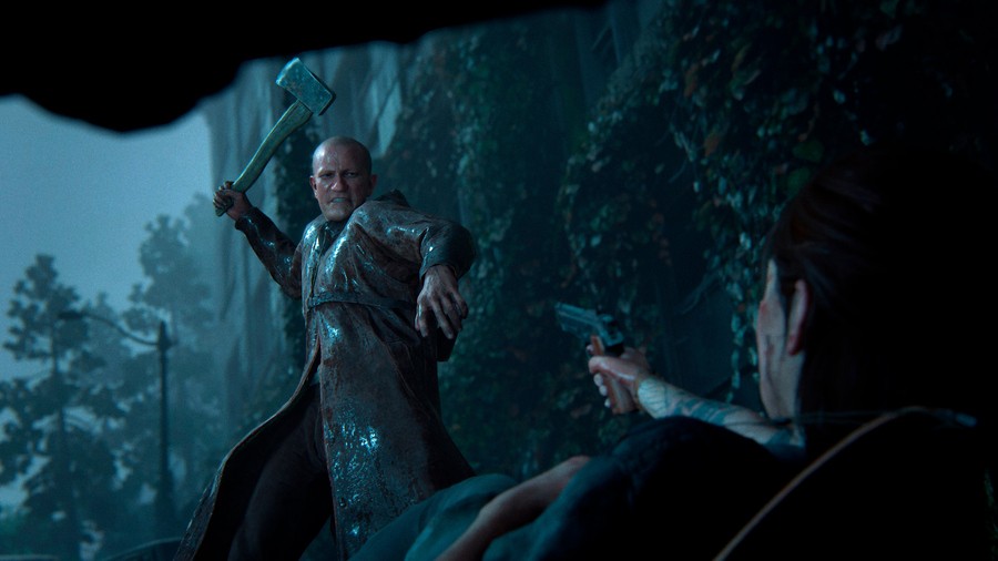 In the sequence we’re allowed to talk about, Ellie is tasked with travelling to a nearby hospital in the grungy downtown streets of Seattle. As with the previous game, nature has reclaimed much of the urban environment, although the leftovers of a fading way of life occupy each wrinkle of the city. There are rusted cars and shattered bus shelters; shops and apartments border overgrown roads, while lingering views of the horizon show your destination.