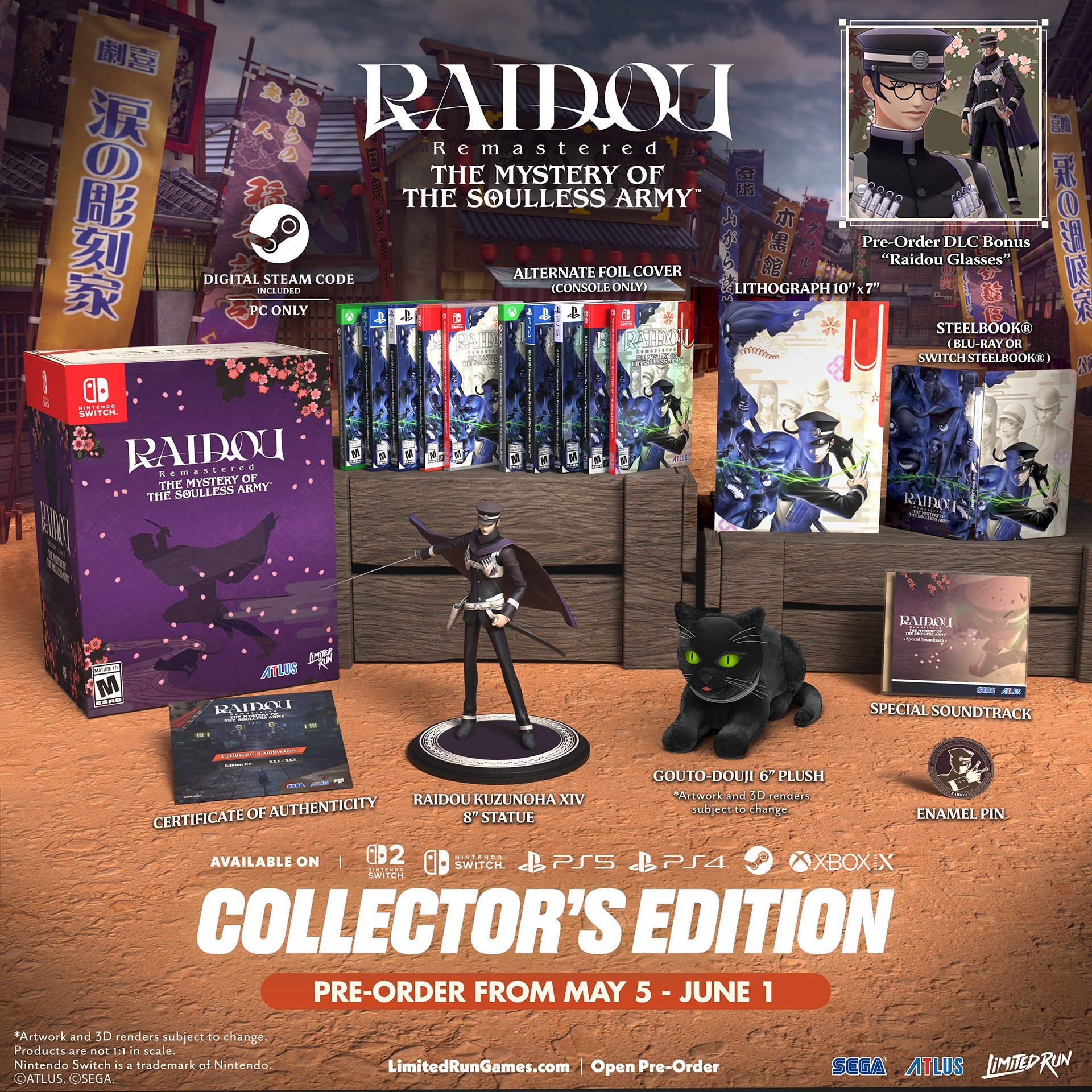 Only just announced and now up for pre-order, the simply named Collector's Edition comes with an alternate foil cover for the game, a steelbook, a soundtrack CD, a lithograph, a 6" plush, an 8" statue of Raidou himself, an enamel pin, and a, er, certificate of authenticity.
