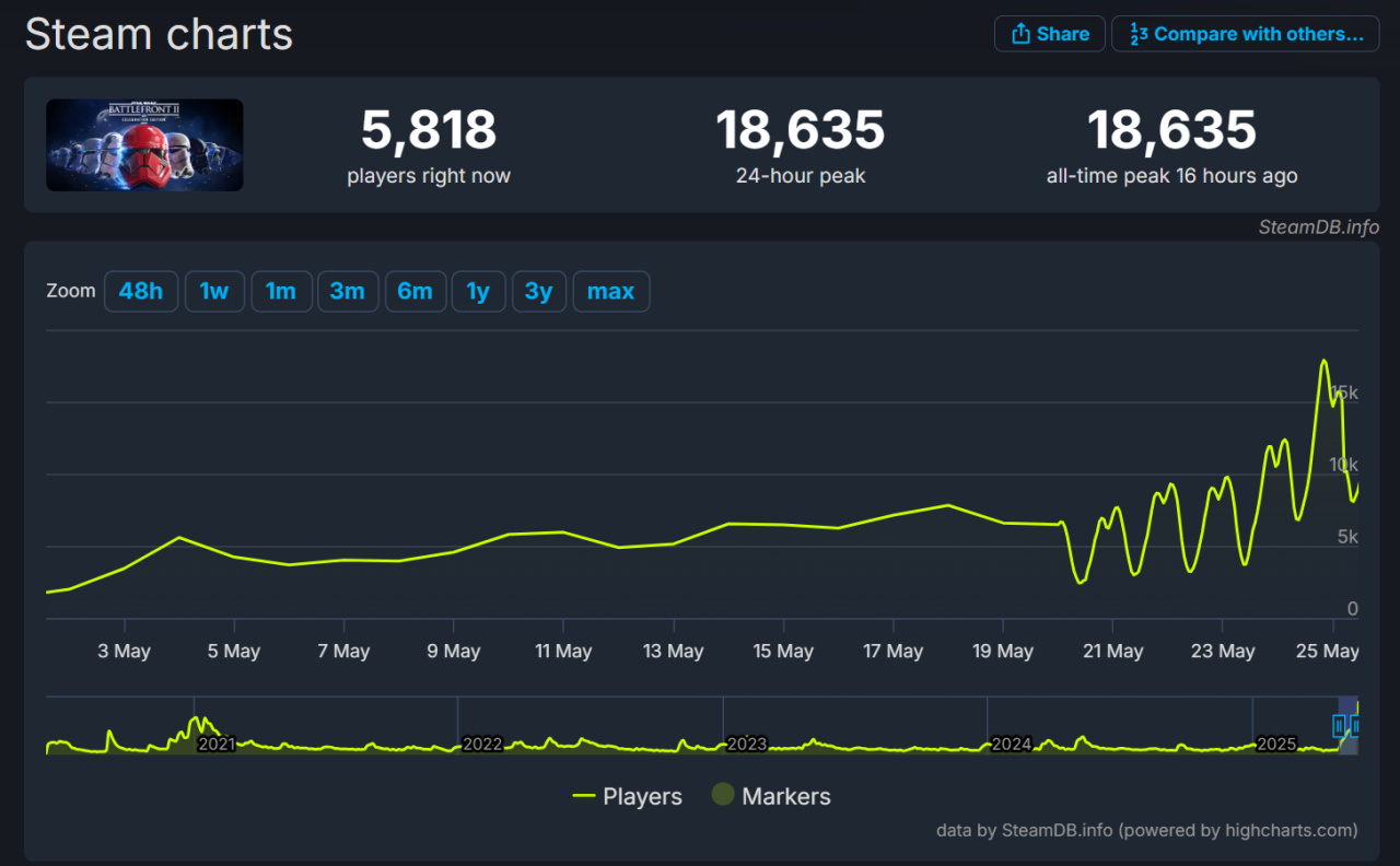 Original Story: Thanks to this month's May the 4th celebrations, the new season in Fortnite, and the second season of Andor, it looks like Star Wars fans are really feeling the Force at the moment, and have decided to return to Star Wars Battlefront 2 in their droves.