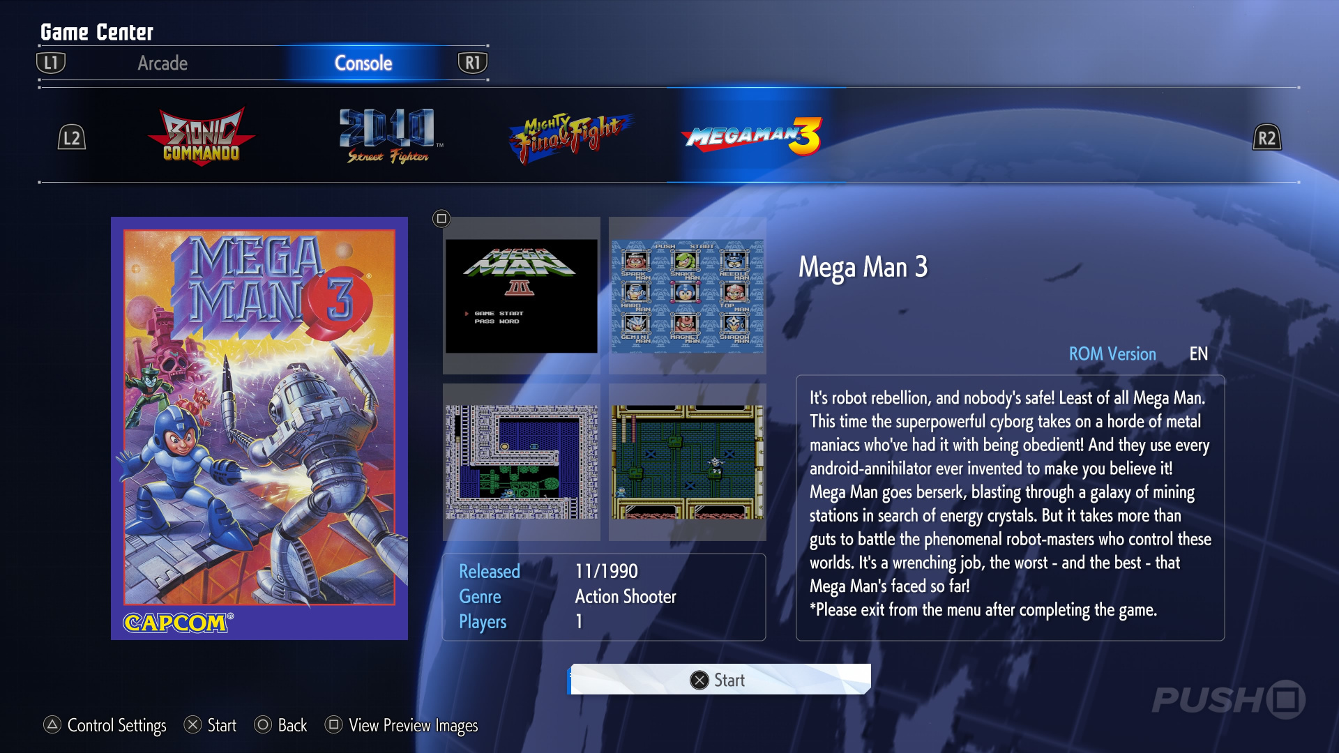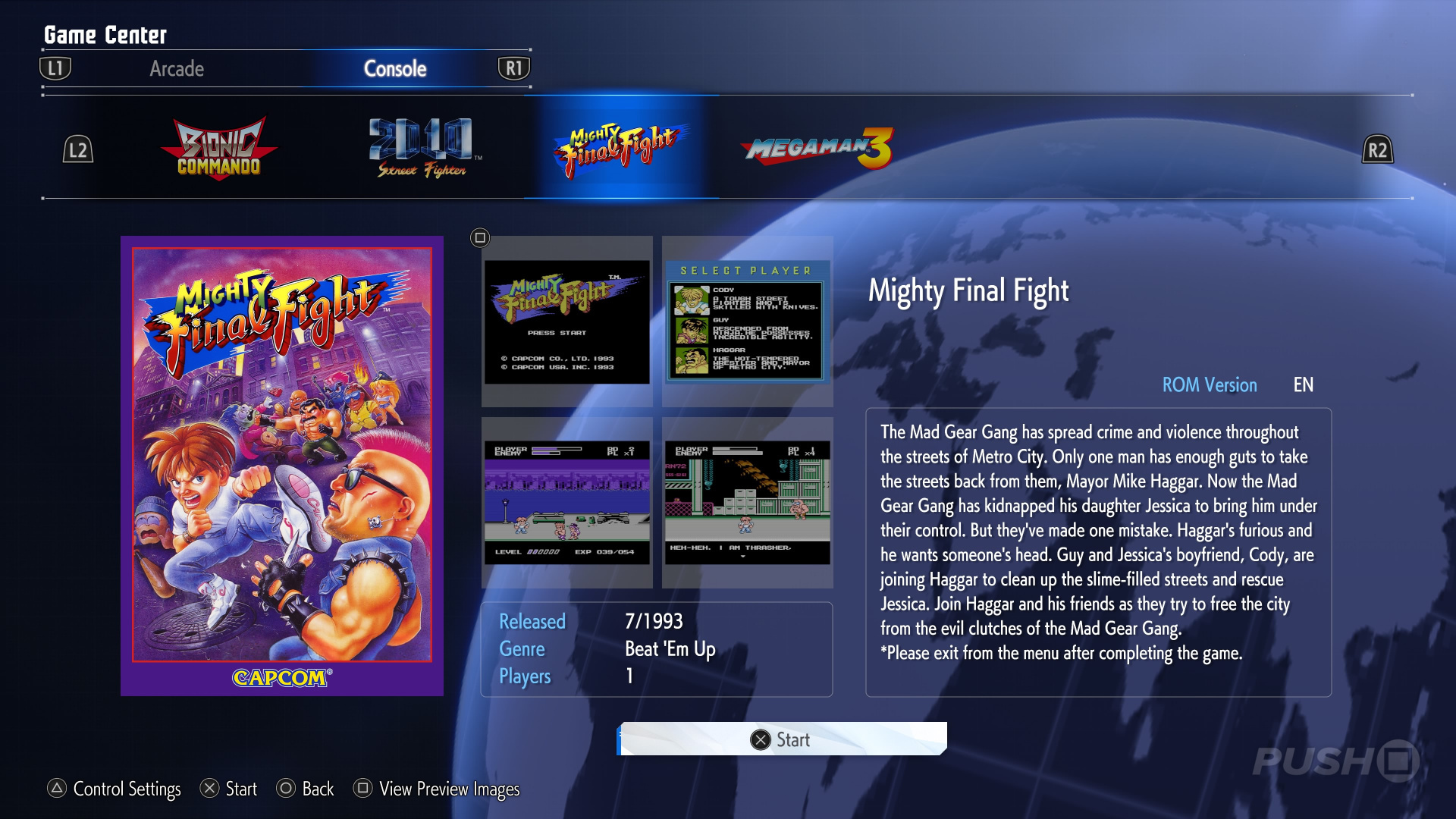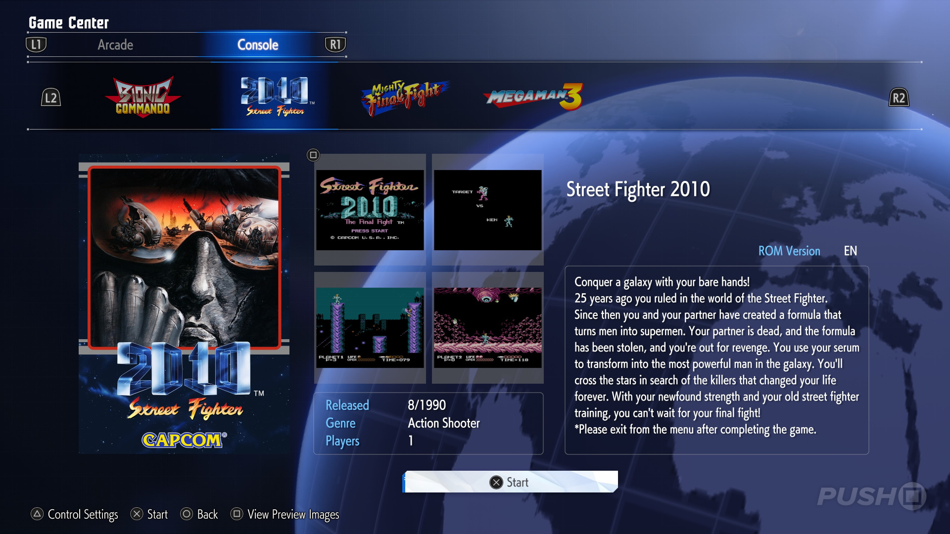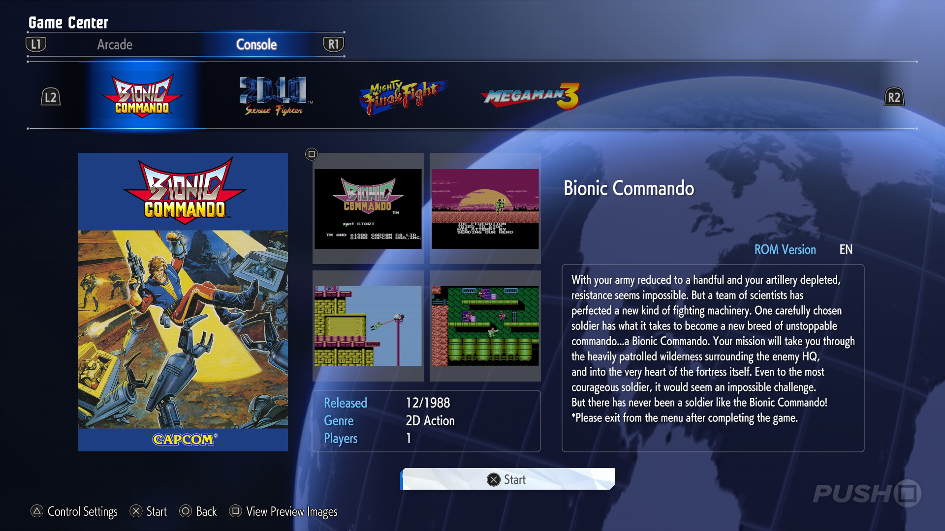 Available to play for free within the game’s Gallery are: Bionic Commando, Street Fighter 2010: The Final Fight, Mighty Final Fight, and Mega Man 3.