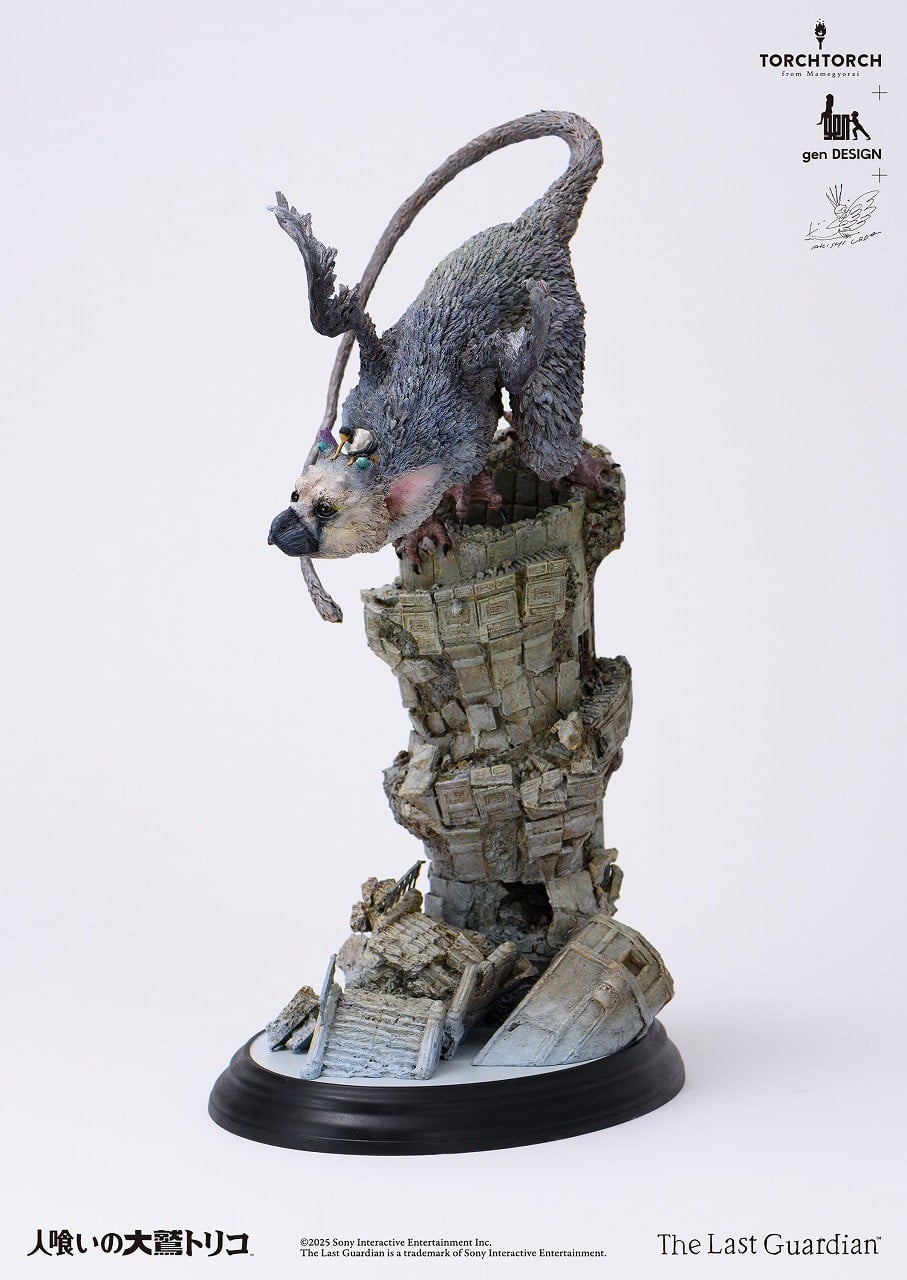 The statue itself depicts Trico about to leap off a crumbling building, with the boy on top of its head. "The complex personality of Trico, including his mysticism as a giant beast, his fierce dynamism, and his adorableness, has been faithfully recreated in three dimensions," it's explained. The description page continues: "The color scheme, which meticulously designs the overall light and dark to make it seem as if there is a sun overhead, is a true testament to Akishi Ueda's skill."