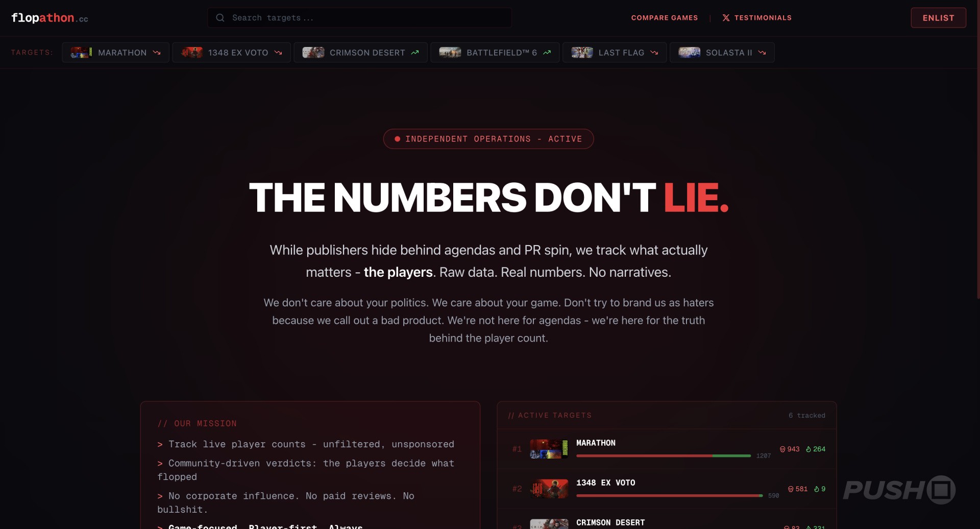 The site's missions are to present "unfiltered, unsponsored" live player counts, facilitate community votes about whether a game has succeeded or flopped, and a firm stance against "corporate influence" and "paid reviews".