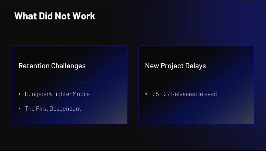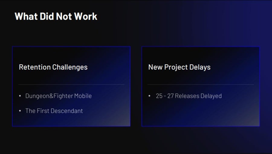 A capital markets briefing from the developer earlier this week had the game appear in a presentational slide headlined "What Did Not Work". The First Descendant appears on the page in a table, pointing to the "retention challenges" it had.