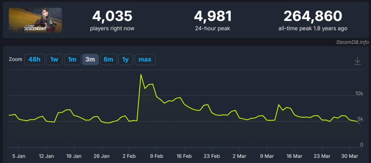 Concurrent player data from SteamDB reveals that, on PC at least, The First Descendant opened strongly with a peak of over 264,000 users around launch. Player interest, as Lee noted, very quickly tailed off, however. Three months after release, the PC version was peaking at around 25,000 concurrent players. Now, in 2026, The First Descendant generally pulls anywhere between 5,000 and 10,000 players at peak times.