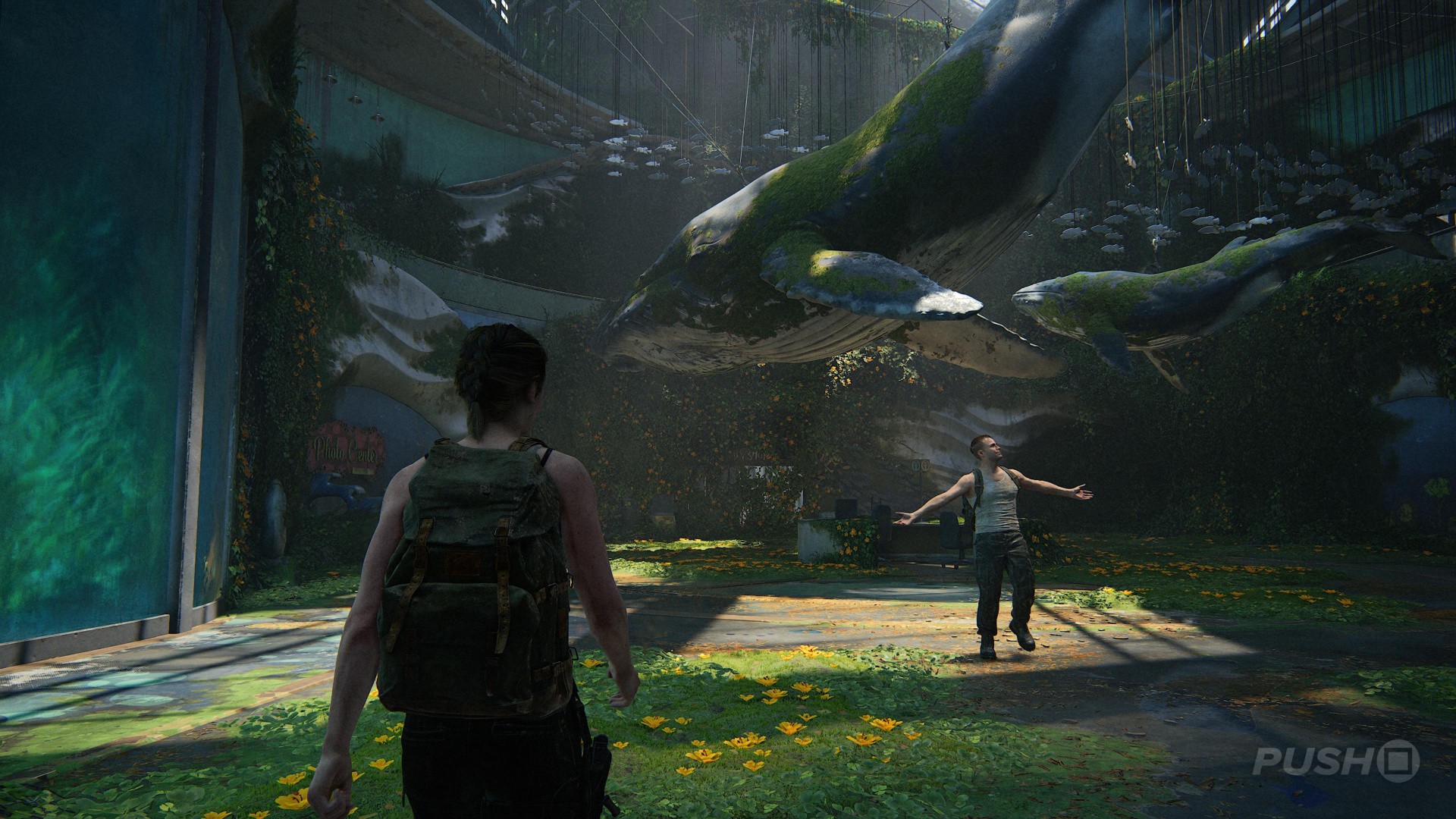 We play through Ellie and Joel's surprise birthday trip to the dinosaur and space museum, then we suddenly cut to Abby and Owen's flashback on the Ferris wheel and inside the aquarium. The Chronological Mode then cuts back to Ellie when she's out clearing infected with Tommy and in a mood with Joel.