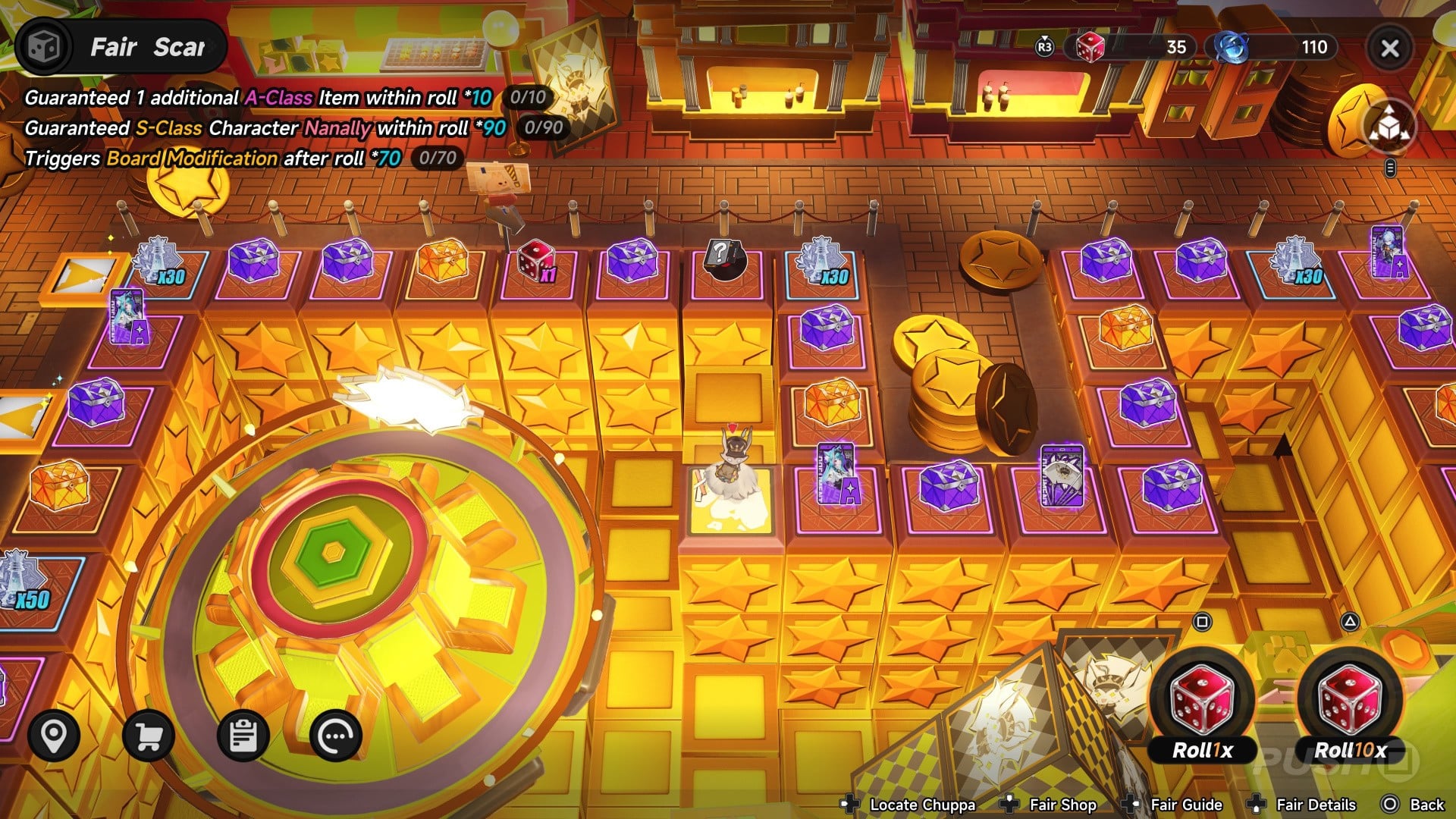 Pulls are presented in a kinda board game format named Scarborough Fair, where you roll dice to make your way around, and each space represents a reward. There’s no 50/50 like in other gacha games here, so once you’ve pulled 80 times, you’re guaranteed to unlock the promoted character.